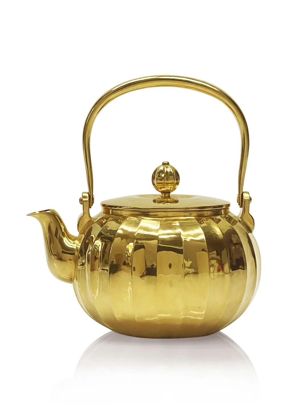 此壶由纯金锻造而成,壶身为分瓣瓜纹,精细美观,较为少见。高耸提梁,美观大方。线条柔美精炼,壶身典雅简约,配宝珠形壶摘,难掩其尊贵气息。