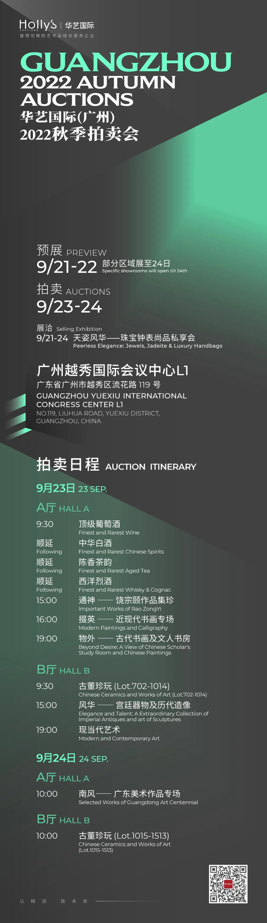 从珠三角始发,华艺国际串联起“京、粤、港、沪”四大艺术品市场核心重镇,多元并进的战略布局在拓展中纵深优化、日臻完善。初心不改,秋色更胜。继北京、香港春拍圆满收官后,广州拍卖会即奉上新程——华艺国际(广州)2022秋拍将于9月21-24日在广州越秀国际会议中心 L1举行。本季拍卖将汇聚中国书画、瓷器·玉器·工艺品、现当代艺术、名酿·陈茶等版块的二千余件臻品佳构,并同时推出珠宝钟表尚品私人展洽。华艺国际希望以一场学术深耕与潮流美学兼备的拍卖,给广大藏家带来美妙丰富的艺术体验,同时激发跨区域文化交流,为共建粤港澳人文湾区贡献一份能量。