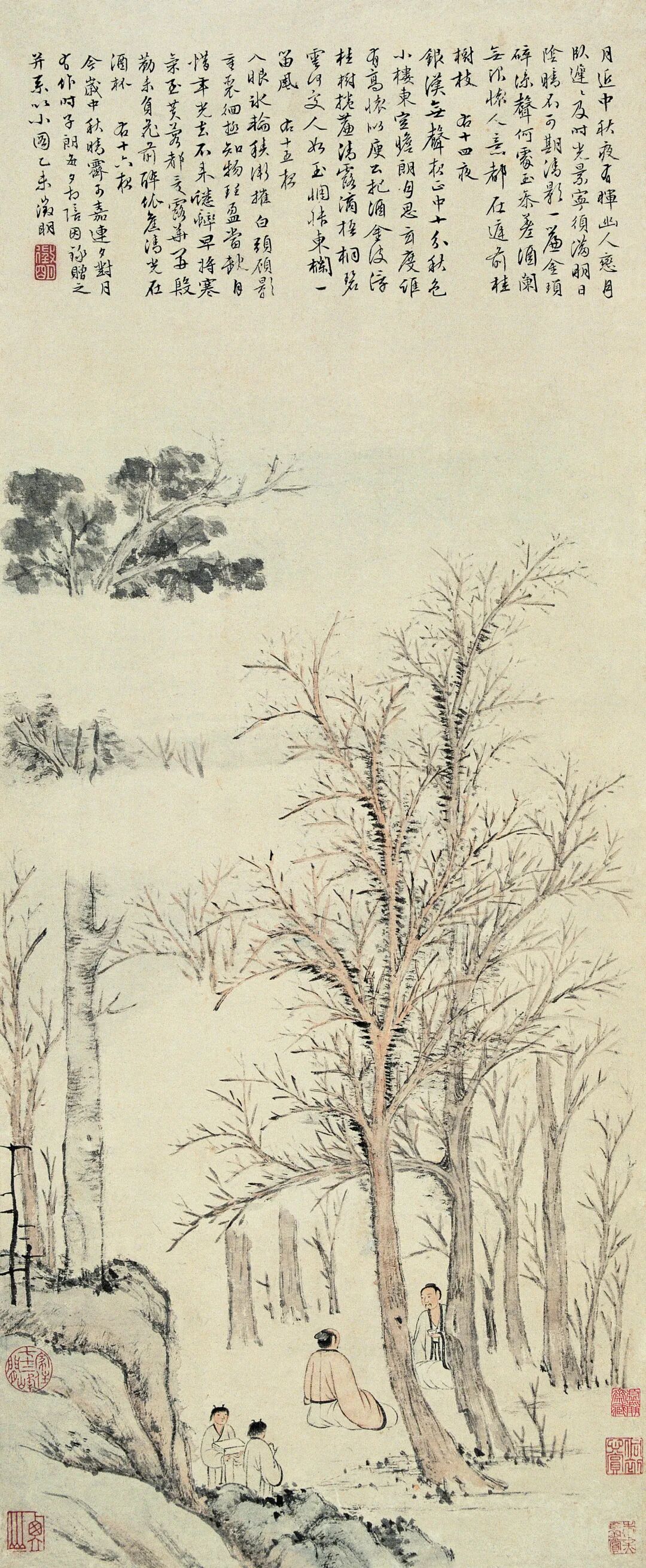 款识:月近中秋夜有晖,幽人恋月卧迟迟。及时光景宁须满,明日阴晴不可期。清影一帘金琐碎,流声何处玉参差。酒阑无限怀人意,都在庭前桂树枝。右十四夜。银汉无声夜正中,十分秋色小楼东。空瞻朗月思玄度,谁有高怀似庾公。把酒金波浮桂树,卷帘清露滴梧桐。碧云何处人如玉,惆怅东栏一笛风。右十五夜。