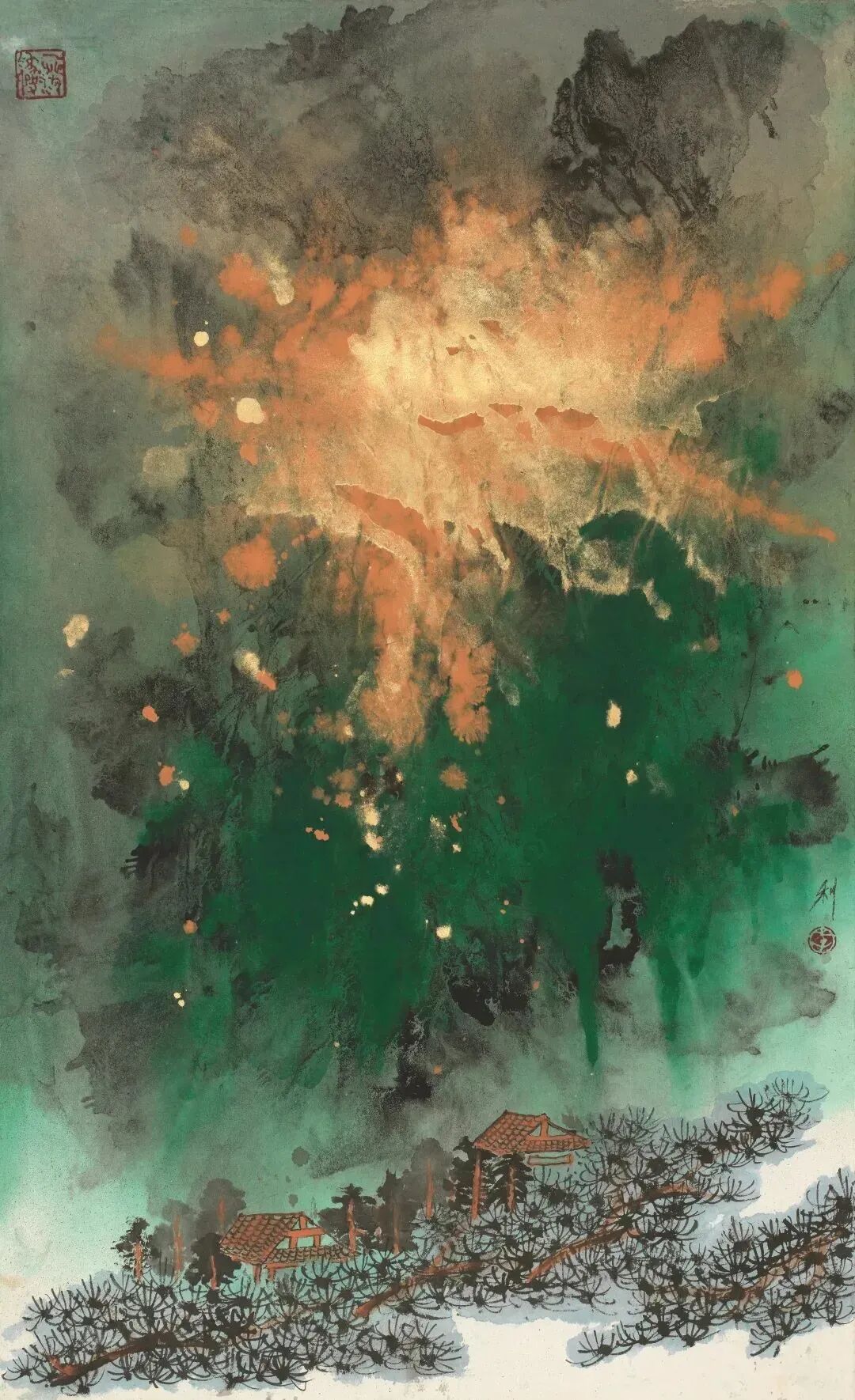 Later, I was transferred to Shanghai from Beijing, and travel around in different cities. At that time, Li Li wrote most about the sweetness and bitterness of diving into creation. With his cell phone and WeChat, I have been impressed by the dedication and refinement of his calligraphy and paintings. One day, he held a solo exhibition in Beijing, and I went there to congratulate him. The original paintings in the exhibition hall were so infectious that it swept me up like a vortex. His use of paper, ink, and color is determined and confident. His ingenious processing of color blocks, clouds and water, mountains and forests into a harmonious unity, coming along with visual impact and spiritual pleasure.