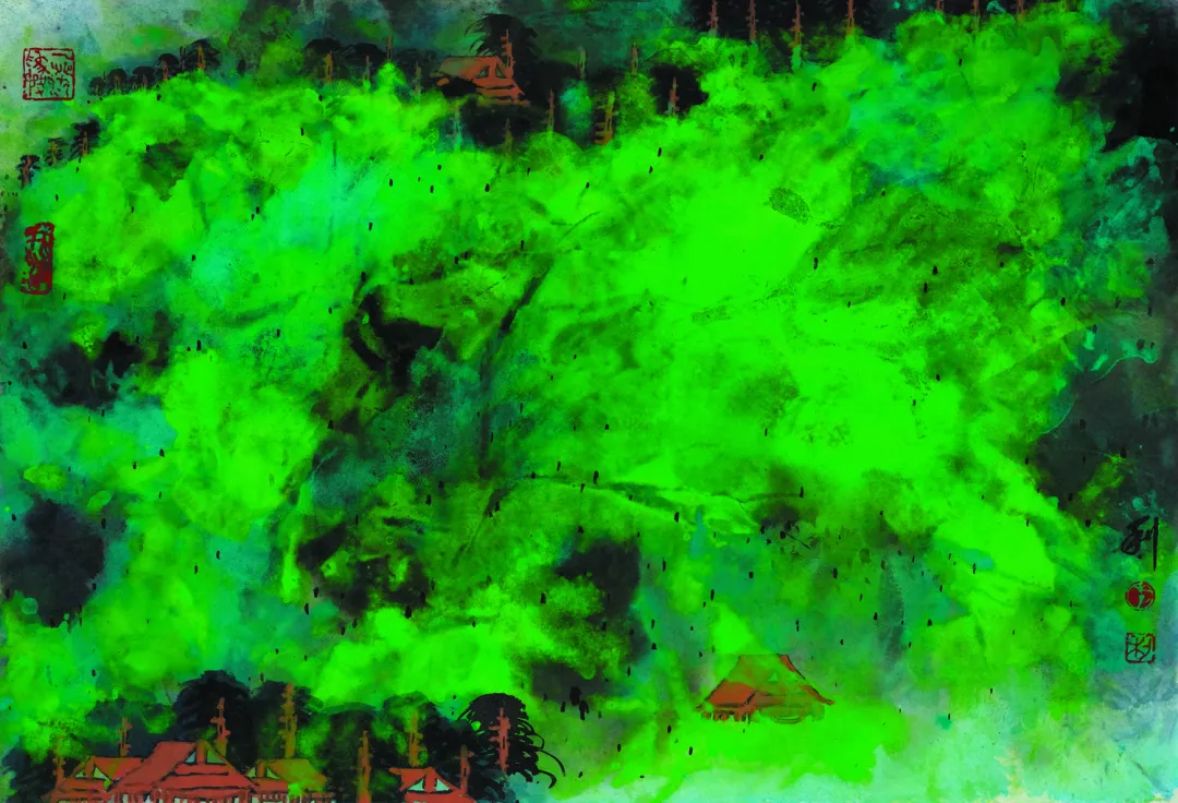 On the whole, Li Li's large scales of colorful landscape paintings, with their bright and exotic colors and rhythms, freely reorganize and change the figurative, abstract, and imagery on the same paper. Thus, He forms a spectacular "symphony of landscape art" which contains Li Li's original individual language. Their graphic contexts are misty and mysterious, and their color are powerful and unusually loud; they are integrating Eastern philosophy with Western science - two cultures colliding against each other, which astonishes us like a shining sparkle. Li Li's colorful landscape paintings inherit and subvert the tradition.