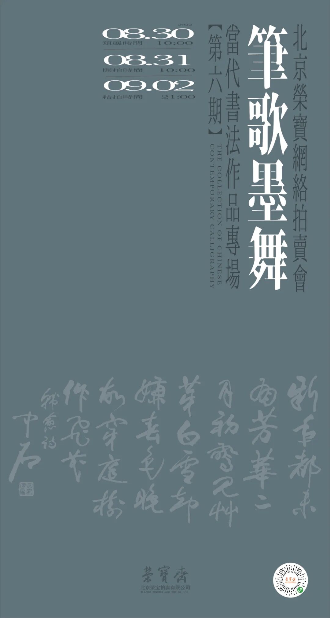 北京荣宝——笔歌墨舞·当代书法作品专场网络拍卖会(第六期)将于8月30日10:00—8月31日10:00开启线上预展,并于8月31日10:00开拍,9月2日21:00结拍。