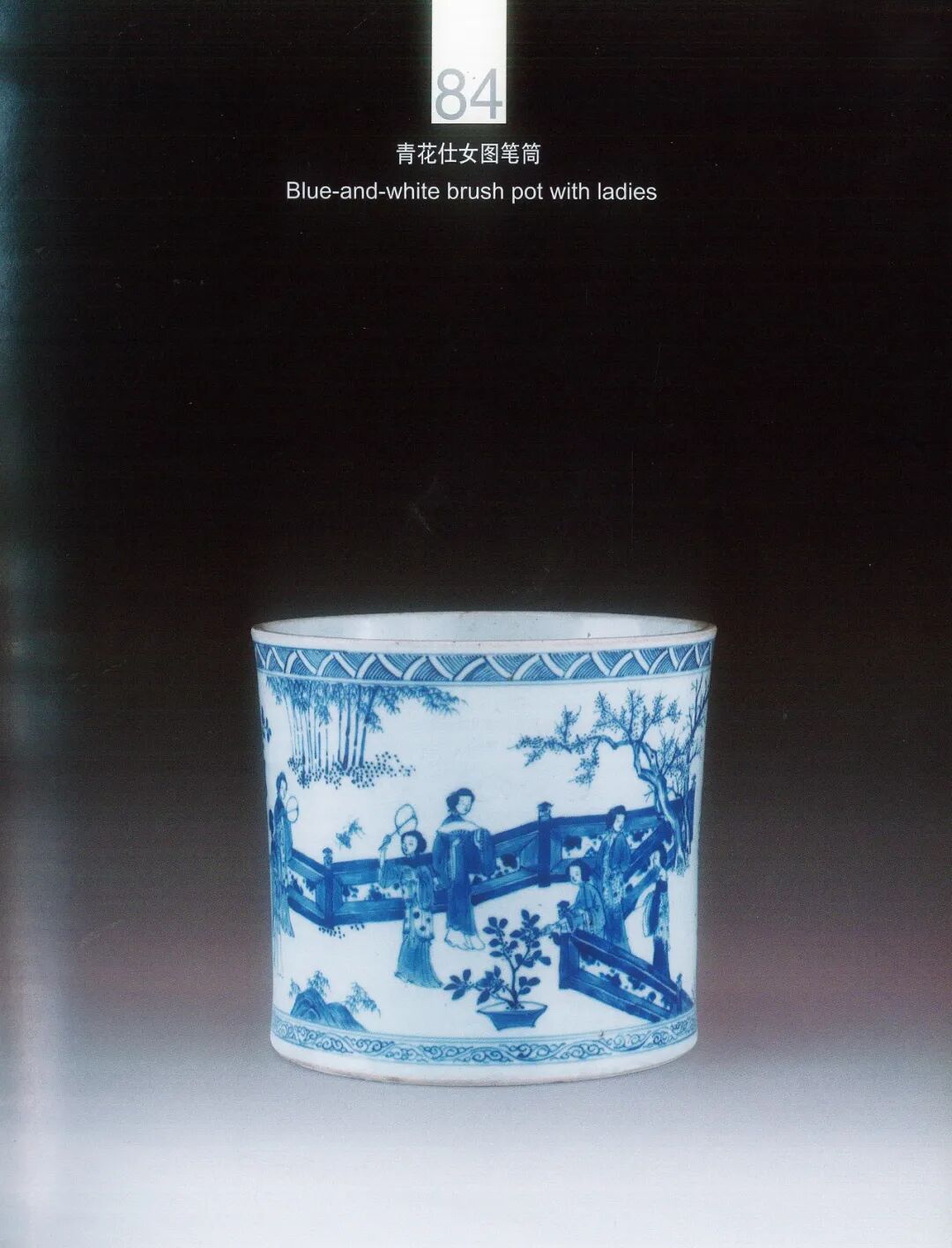 本品通过山石披麻皴皴法可判断为清康熙早期的作品,描绘庭院仕女场景,颇合杜牧诗“轻罗小扇扑流萤”之意境。结合整诗《秋夕》“银烛秋光冷画屏,轻罗小扇扑流萤。天阶夜色凉如水,卧看牵牛织女星”似乎更有别样意境涌上心头。无独有偶,“上海博物馆与英国巴特勒家族所藏十七世纪景德镇瓷器”展览中,亦有一件以此诗意入画之康熙早期笔筒,对读成趣。