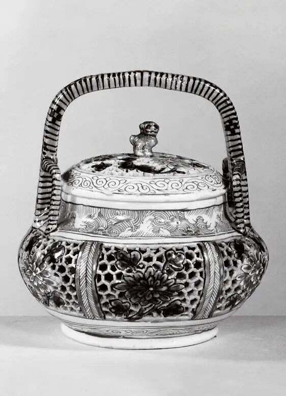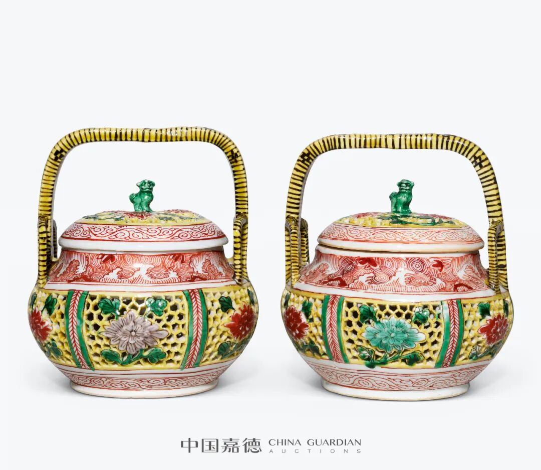 清康熙 五彩镂空花卉纹提梁狮钮香薰一对