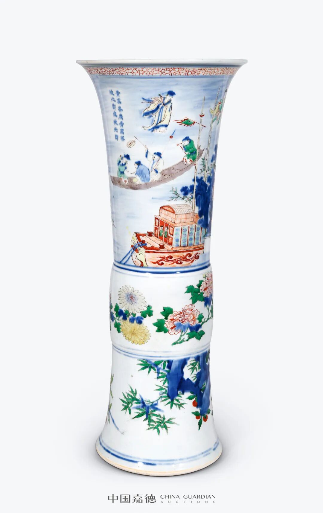 清顺治 青花五彩青袍记人物故事诗文大花觚