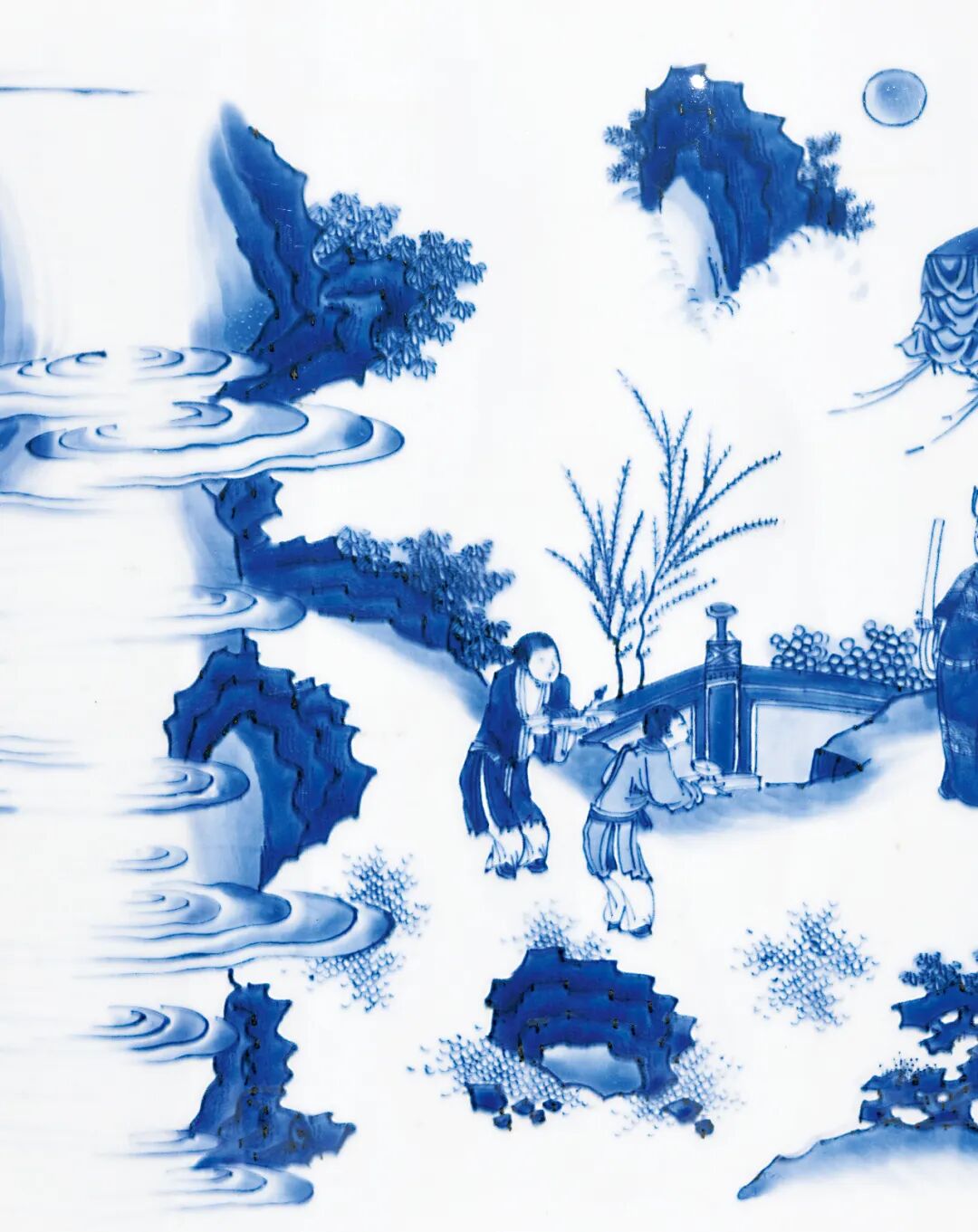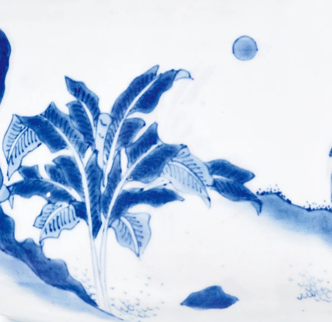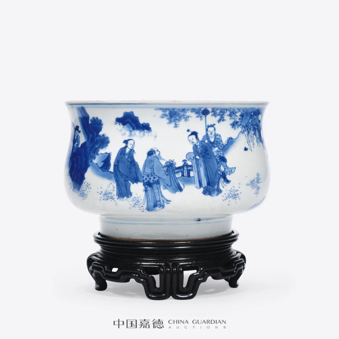 本品所描绘人物故事纹样,应属于此时期流行的访贤类故事题材,而确定故事情节的重要道具是其中高士手捧的圆形物,此为何物却未有定论。一说认为此为和氏璧,描绘完璧归赵情节,然璧未绘孔,仍有不妥。故事纹样的有待探索,亦增添了本品的研究价值。而抛开题材,本品无论体量、纹饰描绘,还是青花发色,均属上乘,值得关注。