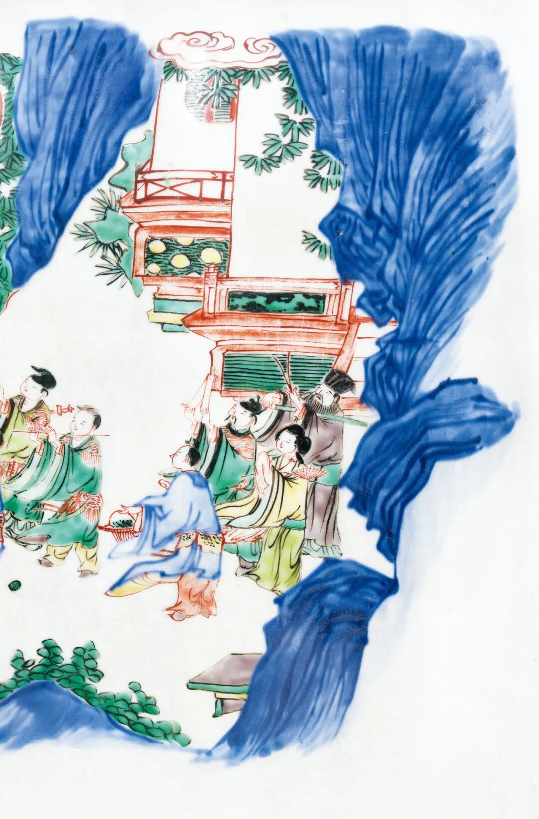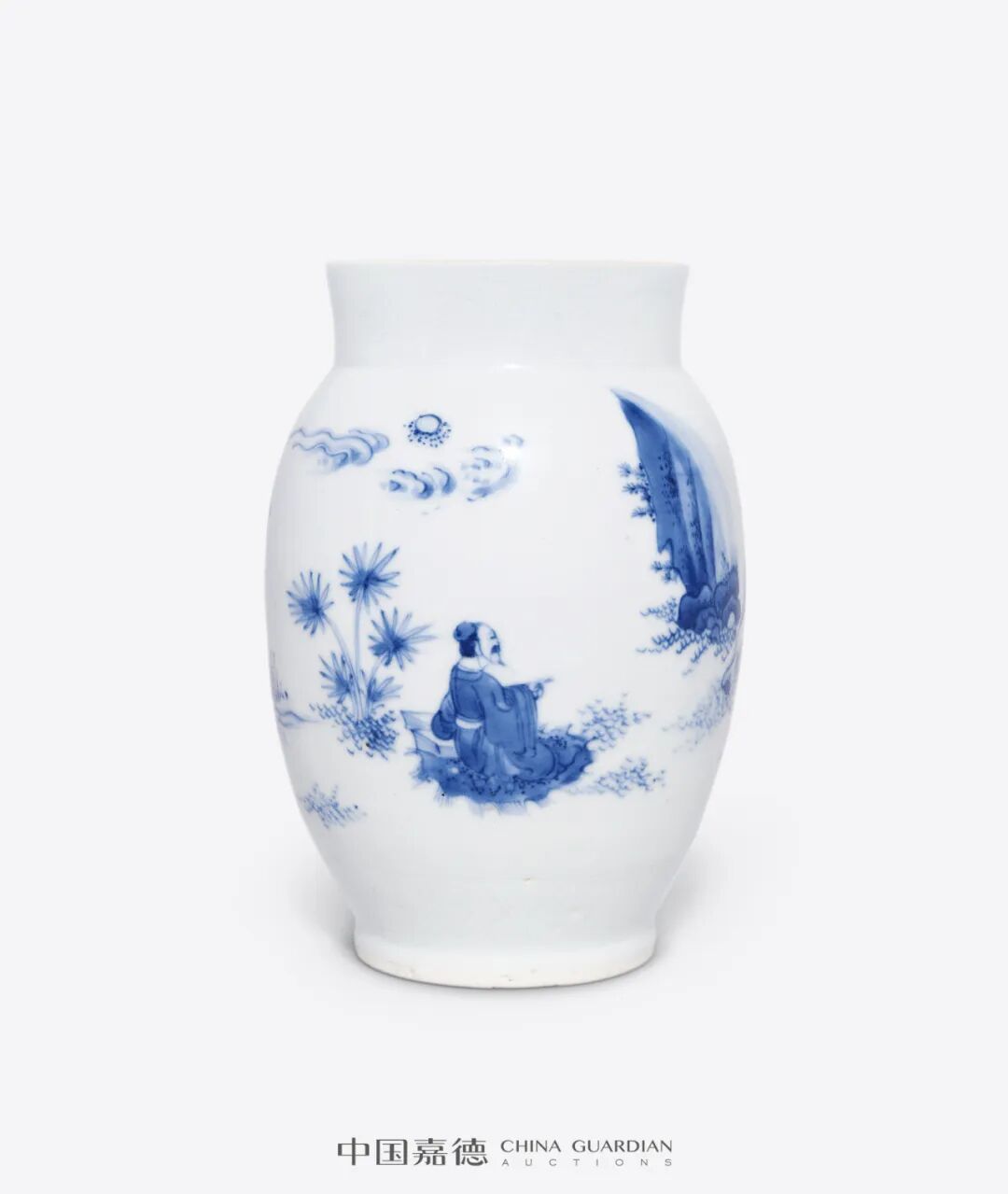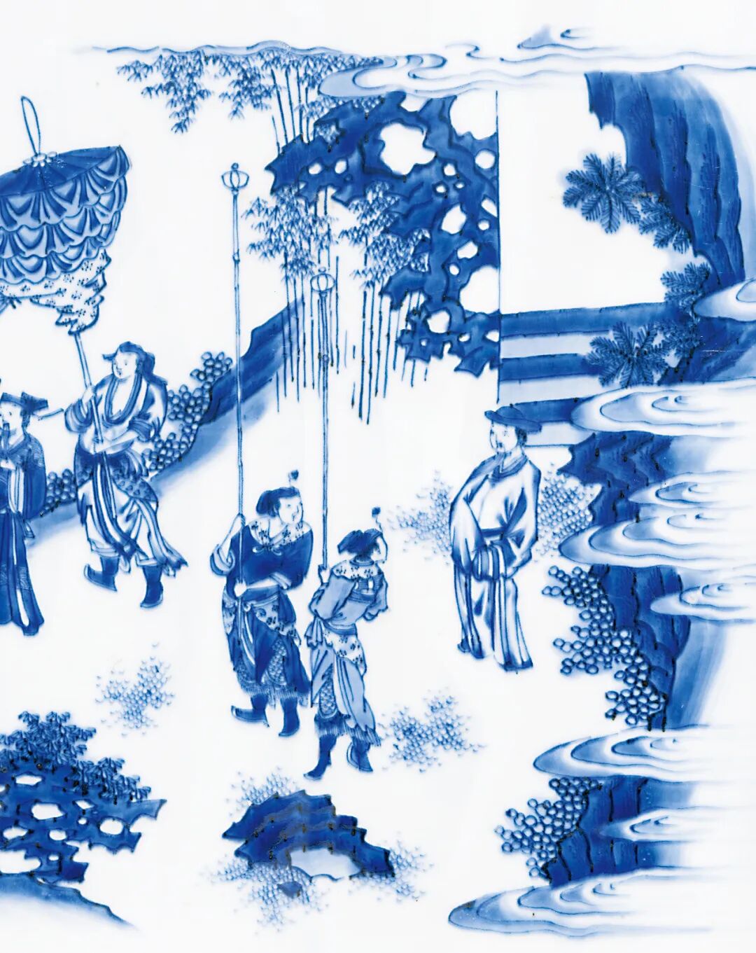 本品所描绘人物故事纹样,应属于此时期流行的访贤类故事题材,而确定故事情节的重要道具是其中高士手捧的圆形物,此为何物却未有定论。一说认为此为和氏璧,描绘完璧归赵情节,然璧未绘孔,仍有不妥。故事纹样的有待探索,亦增添了本品的研究价值。而抛开题材,本品无论体量、纹饰描绘,还是青花发色,均属上乘,值得关注。