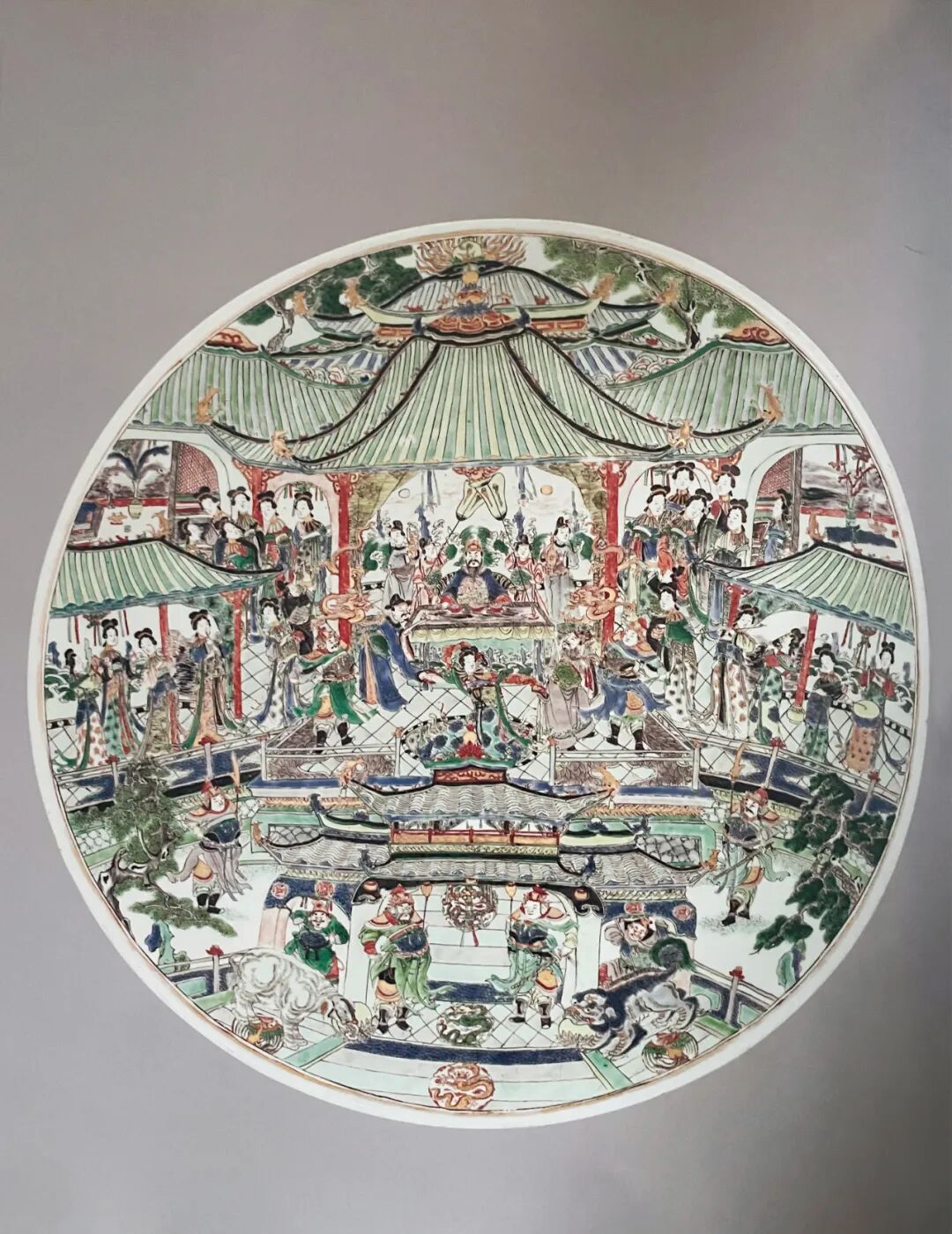 本品特殊之处有四,其一为其题材特殊,转变期描绘人物故事题材,以唐明皇游月宫者较为少见,其多见为蟾宫折桂;其二为其于平面微凹之盘,装饰出三层远近关系;其三为其体量硕大,熙朝六十公分大盘实属罕见;其四,洁蕊堂藏有一件康熙五彩大盘,其花押款识与本品相似,由此可以推测,当时此类体量硕大的康熙佳作,应出自同一窑厂。无独有偶,巴黎曾释出一件康熙青花四美图大盘,与本品尺寸、辅助纹饰以及绘画风格均相同,亦当同窑所出。