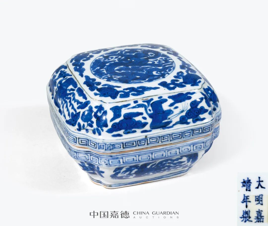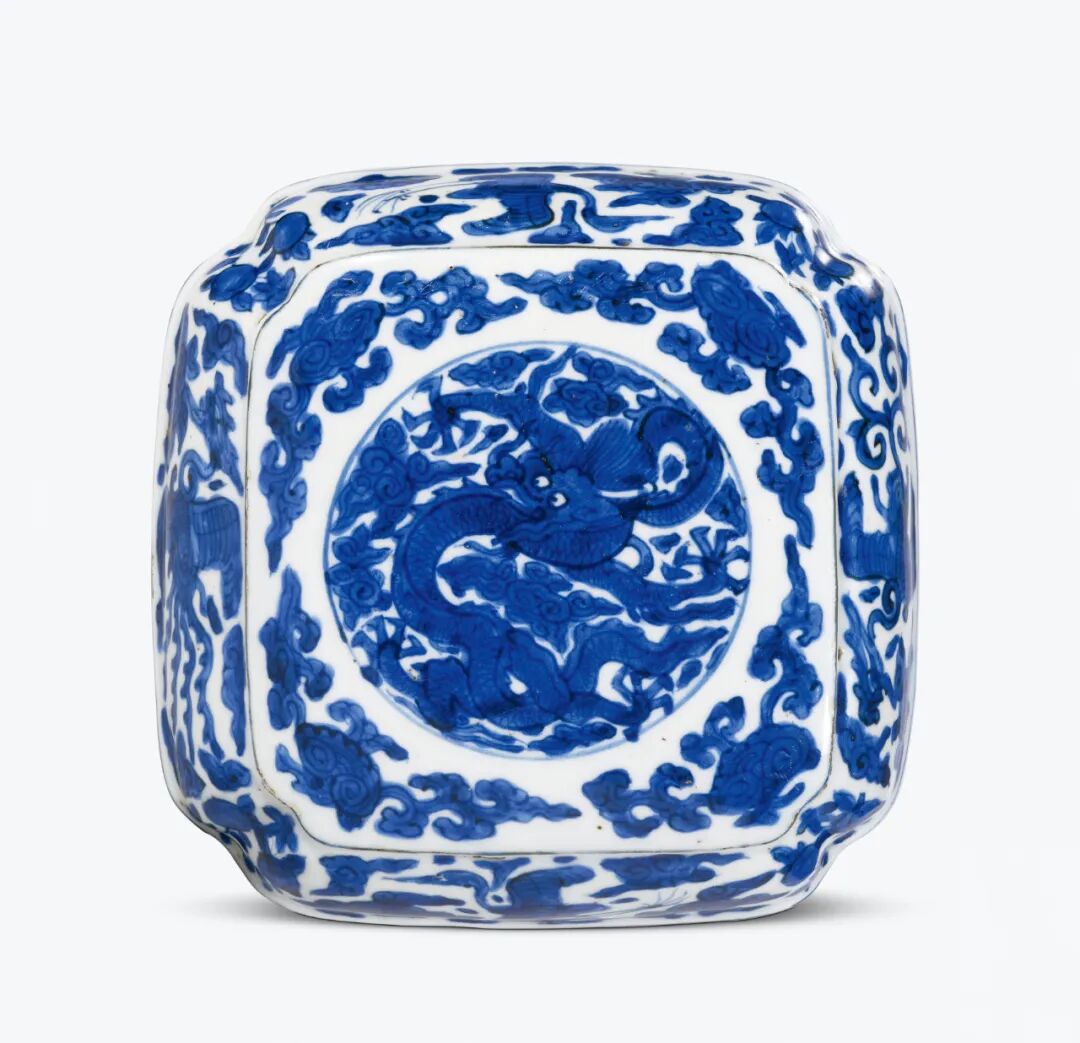 明嘉靖 青花云鹤开光云龙纹四方倭角盒