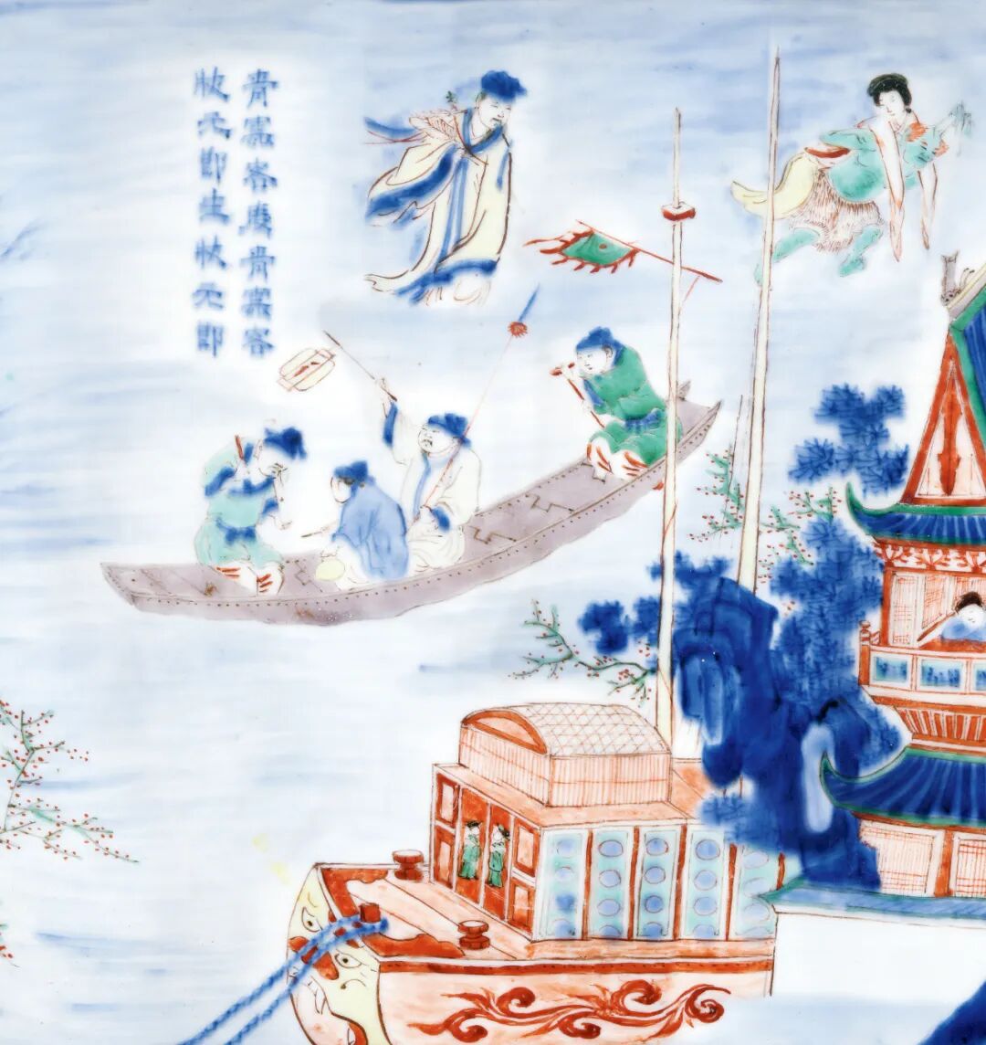 本品所绘人物故事当取自《青袍记》之“天赐夫人”一节。《青袍记》又名《梁氏父子传胪记》,为明代著名戏曲小说。主要讲述了宋代东平梁灏的故事。梁灏寄寓望仙楼读书时,吕纯阳得其救护。当纯阳来谢恩时,发现梁灏逾龄而尚未娶妻,于是遣柳树精于起大风时,摄东平太守薛琼之女给梁灏。梁灏见女子的身上无衣,遂以青袍盖之,负归薛家,薛琼即以女妻之。