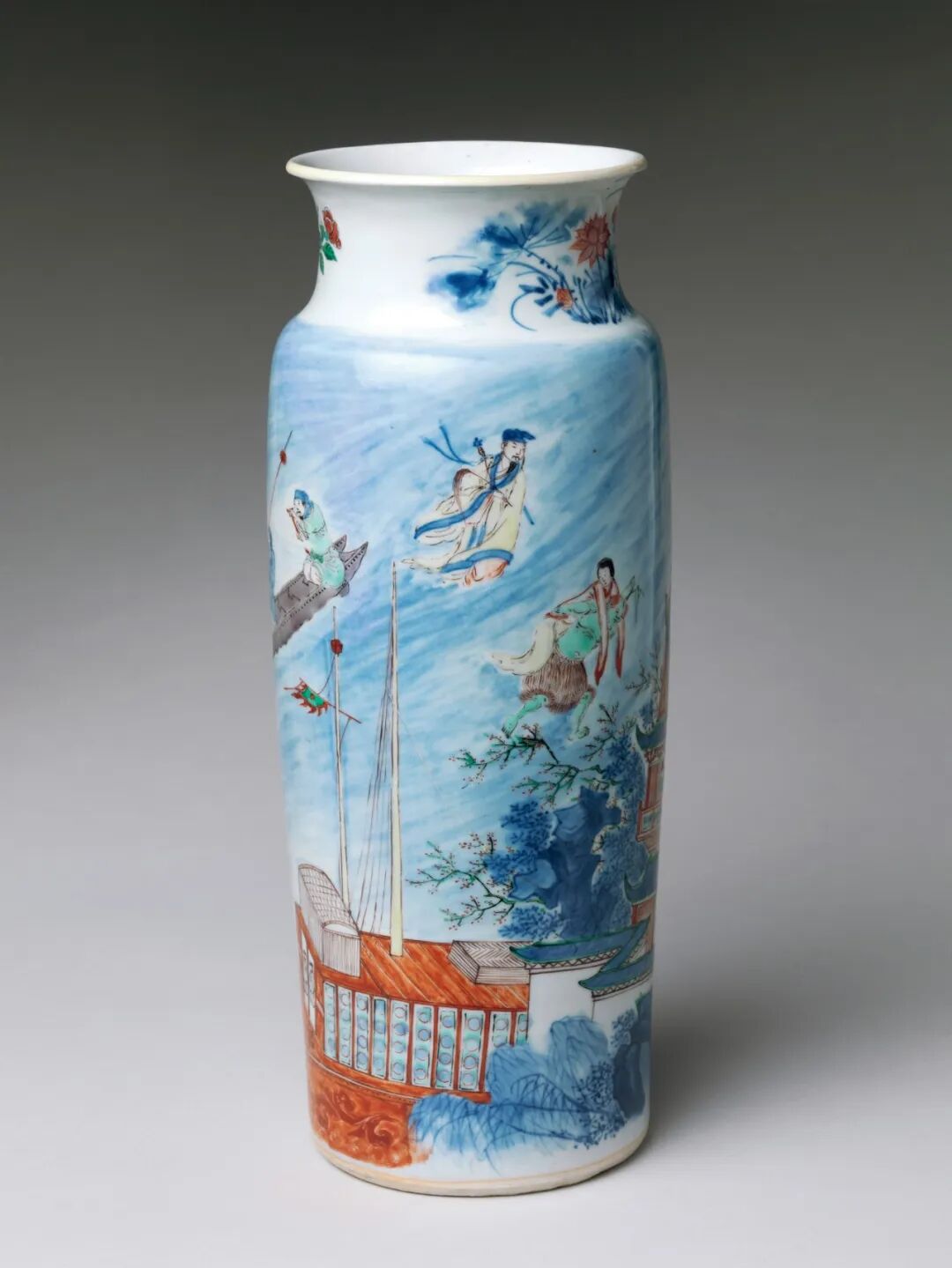 清顺治 青花五彩八仙庆寿图筒瓶