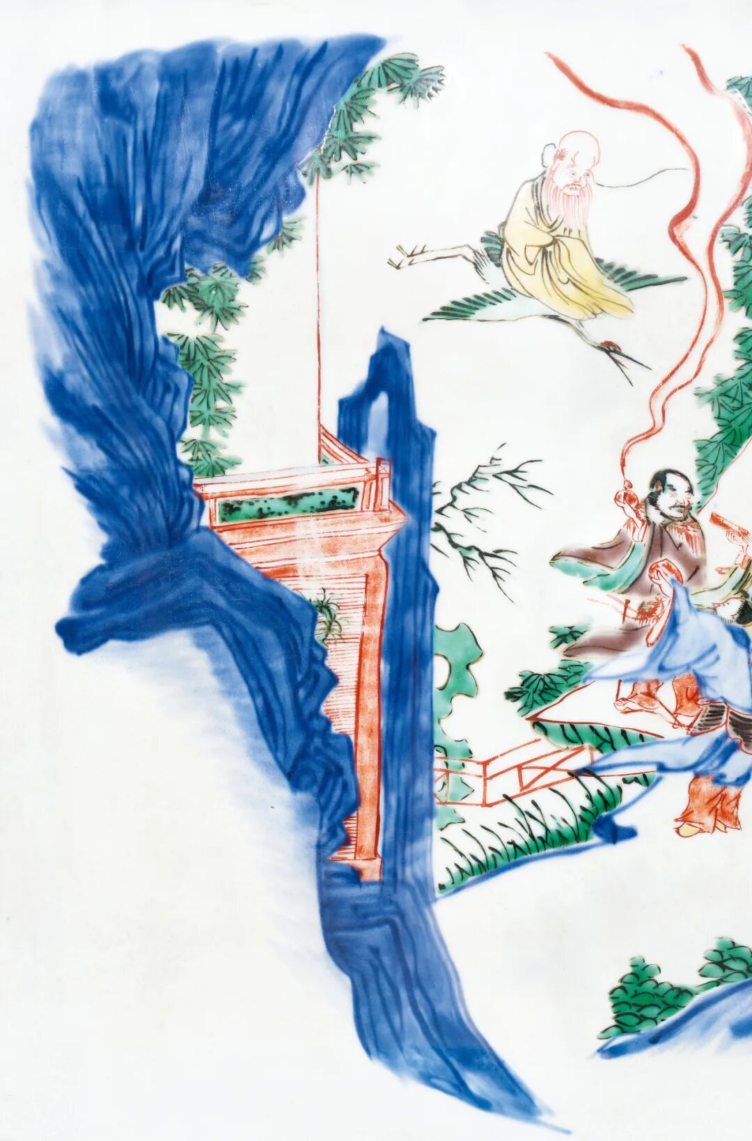 八仙图案是中国陶瓷装饰的典型纹样,早在元代龙泉窑瓷中就已应用。而明朝皇帝崇奉道教,故使得八仙图案的应用更为广泛。本品青花、彩料发色俱佳,人物描绘亦颇为精细,最值得注意的是其山石皴法,不同于常见顺治的大块平涂渲染,内有青花长批麻,尤为特殊。