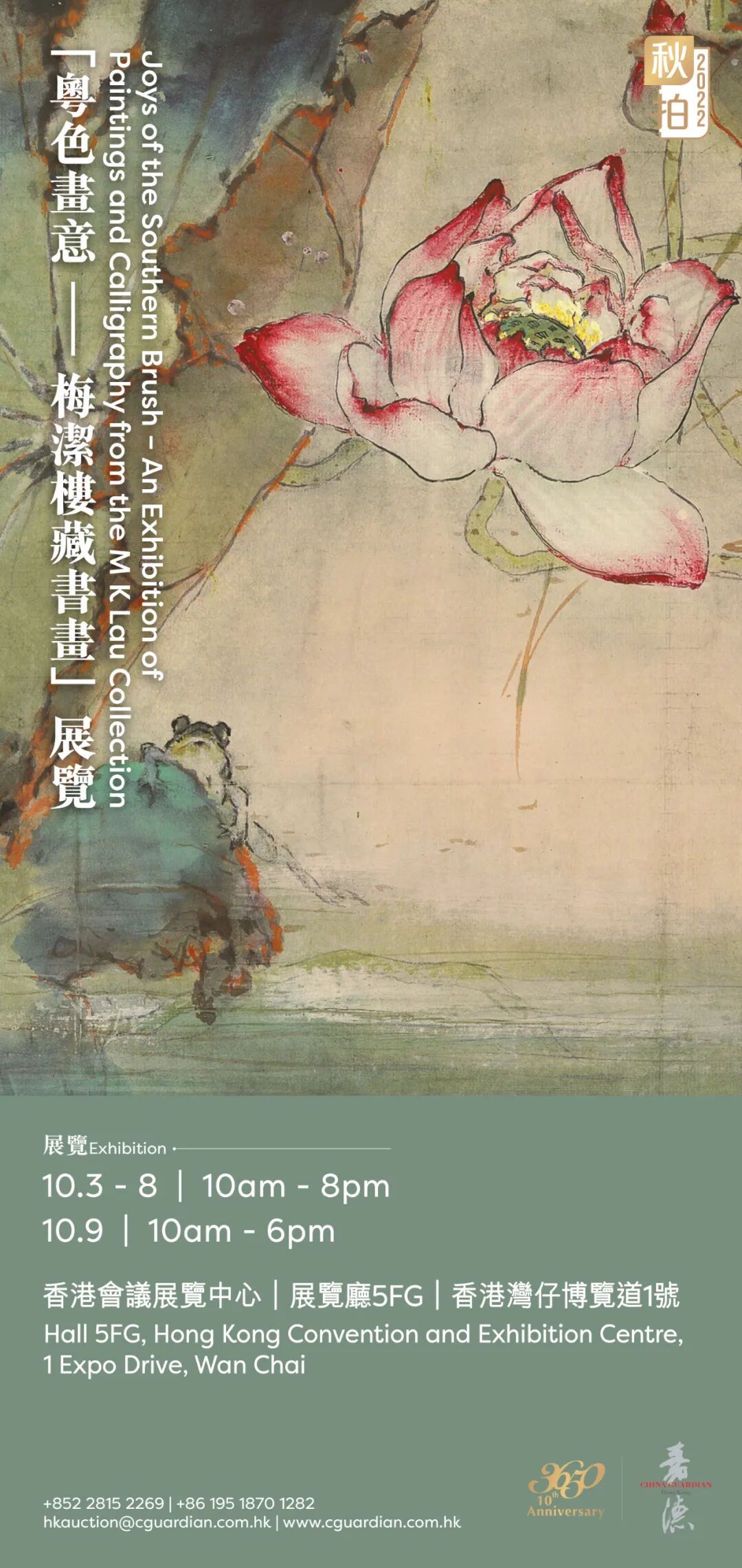 我们荣幸地宣布,中国嘉德(香港)于2022秋季十周年庆典拍卖会期间,将与梅洁楼假香港会议展览中心合作举办「粤色画意 – 梅洁楼藏书画」展览。梅洁楼珍藏根植于香港,以其独特的收藏品味和意旨,苦心孤诣数十载,尤以入藏近现代百年名家书画为大宗。其收藏涵盖晚清至当代各名家之精品佳构,务求最大限度地呈现每一个画派宏观的艺术景象。是次展览以其粤色画意主题的珍藏为脉络,精心遴选作品逾百幅,筹划编辑成册,完整重现了岭南画派在百年风云中的成长面貌。相信这个充满浓郁南国气息的精彩展示会成为港岛十月的艺坛盛事。