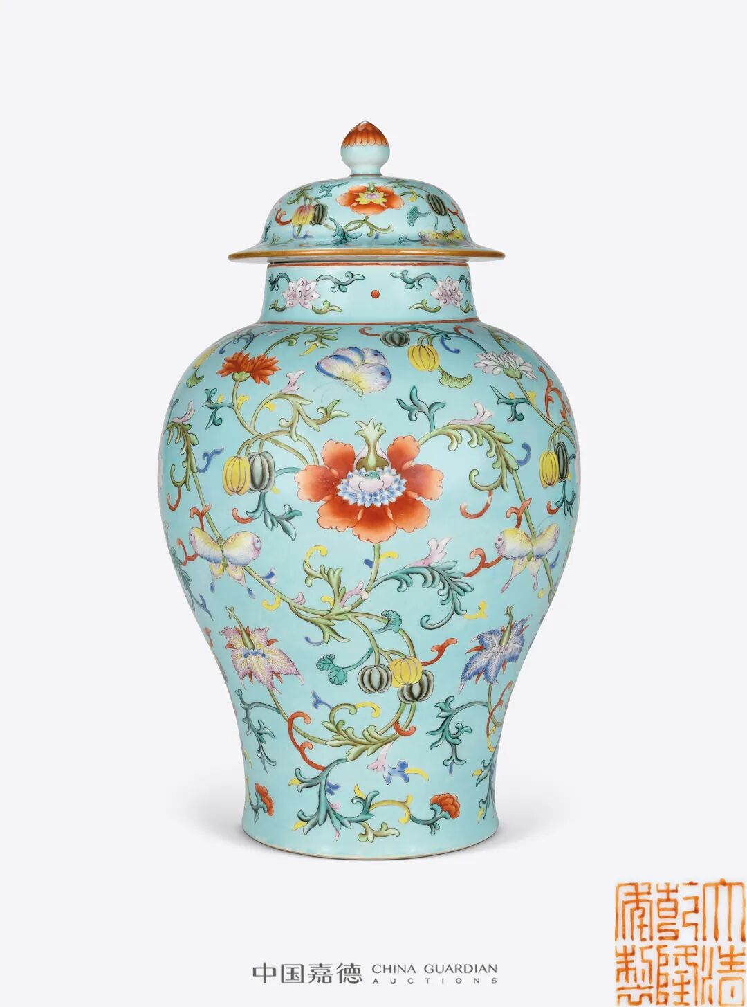 松石绿地洋彩缠枝花卉瓜瓞连绵图将军罐