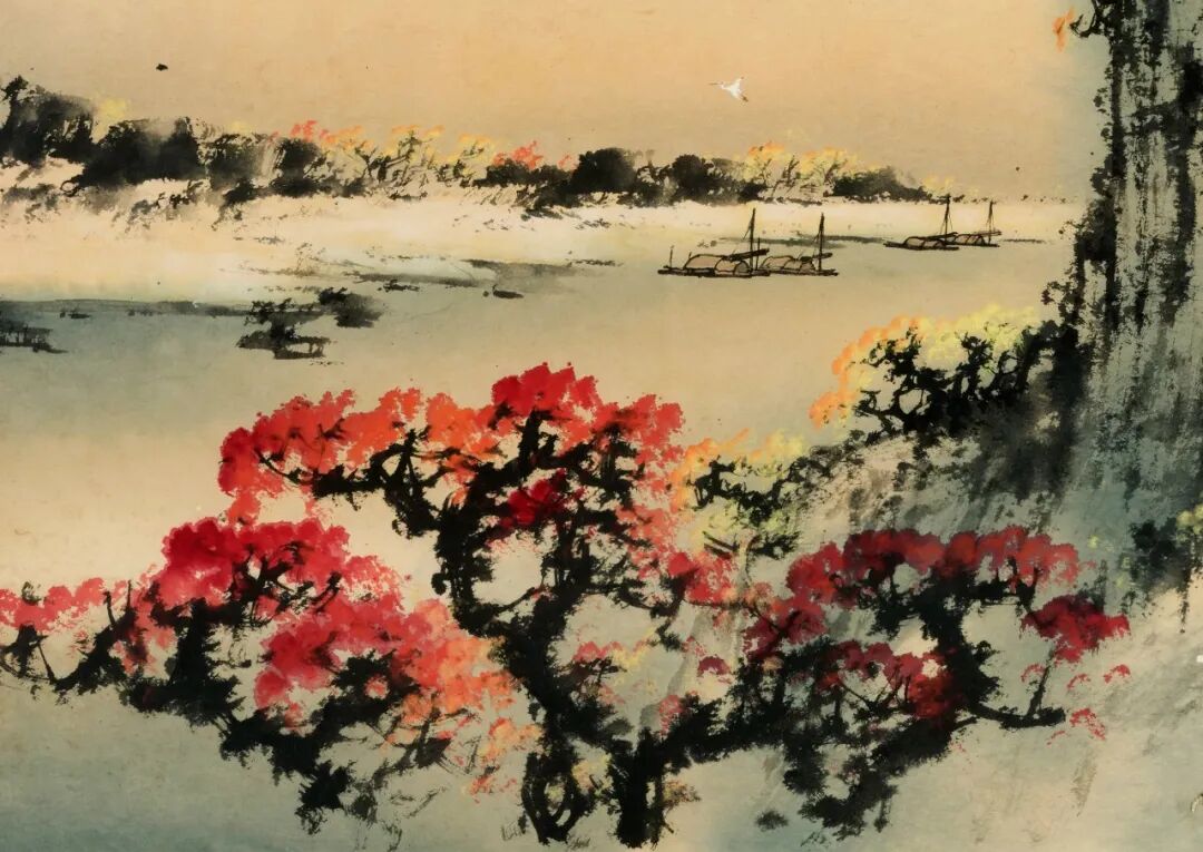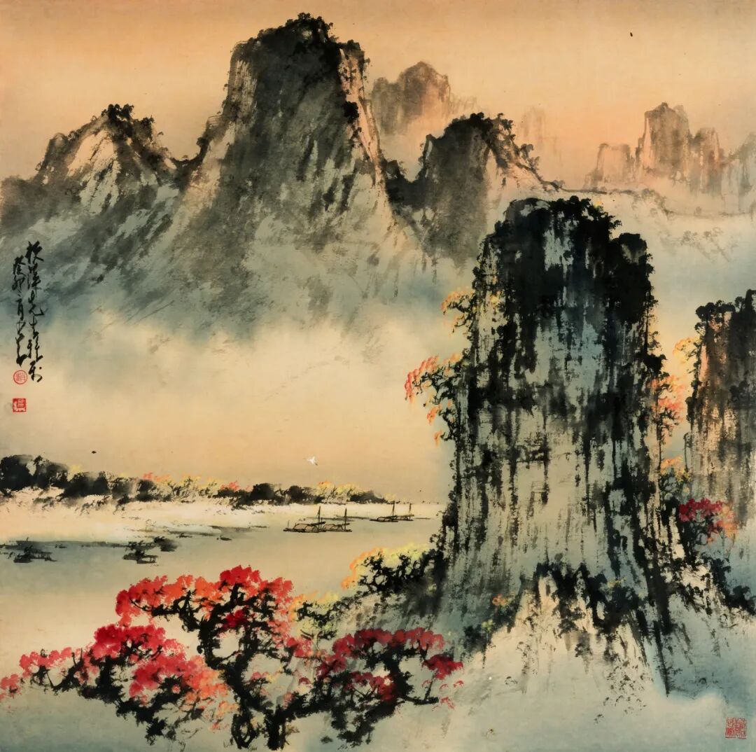 此幅作品写于1963年,是时画家应邀正于美国的多个博物馆、艺术馆及学校举办画展、讲学,轰动一时,深受当地各界人士赞誉。本幅正是作于这一时期的精意之作。作品以胜景桂林漓江入画,以兼工带写的技法,将漓江的山青、水秀、石美的绝景展现于观者眼前。抗战期间,赵少昂曾被国立中央大学及国立艺术专科学校聘为专任教授。为此,其曾独自由湛江启程,途经广西、贵州至重庆,沿途写生并多次举行画展,将义卖所得捐予赈灾,广受赞誉。在去重庆应聘前,经广西桂林,醉心当地秀美的风景,遂暂留该地写生,以致耽搁了做教授的工作,足见其对桂林山水的钟情程度。此幅画面中,以漓江峰峦耸秀、百里锦绣的基本构图入手,惟疏密有致、主次分明。前景和远景的山峰峻峭玲珑,郁郁苍苍;前景之红树仅留画面的十分之一,画家取其奇,敷以艳丽绝伦的朱砂色,使其更绝娇媚,别有韵致。笔墨以渲染的方法表现出漓江天色、水色、山色,细致传神,彷佛诗境般的天真隽永。