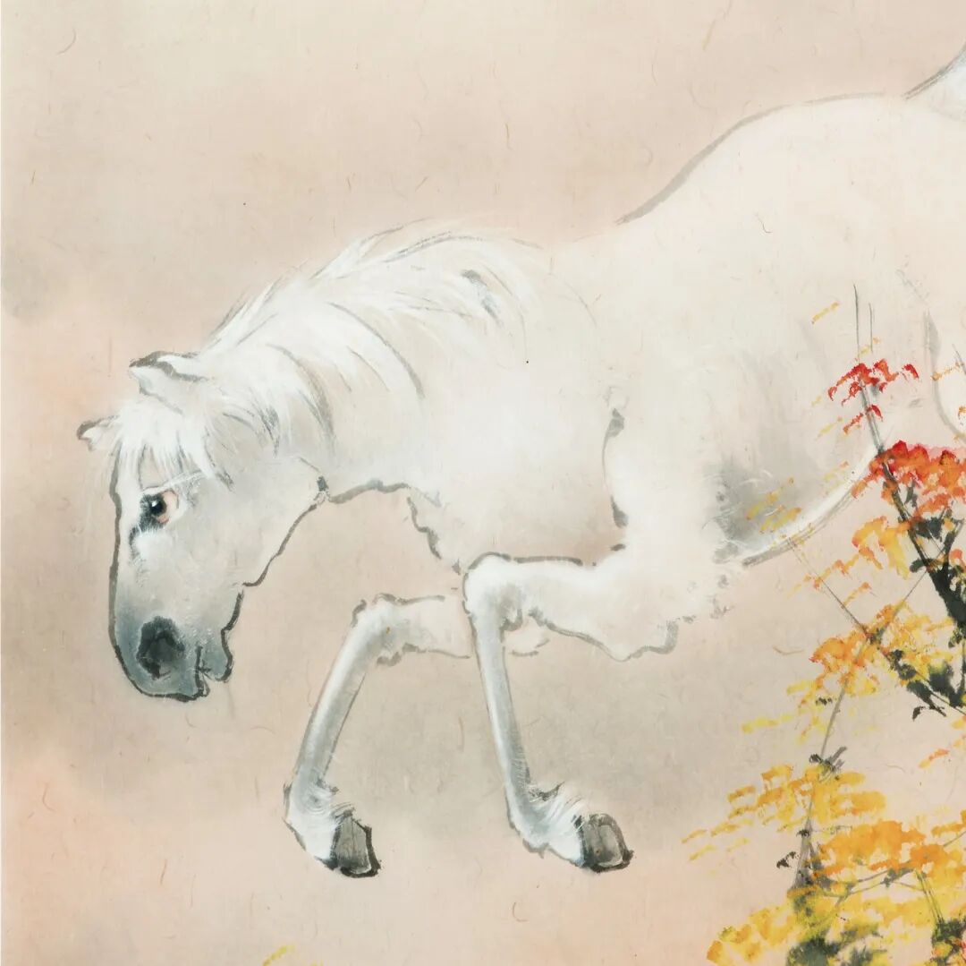 赵少昂秉承高奇峰的画艺,在传统中国绘画的基础上汲取西洋绘画之精髓,笔下所写走兽极重写实。他在成名之后,游历全球,在海外进一步深入地接触西方技法,并将其与传统的中国绘画相糅合,最终形成赵氏独具特色的艺术风格。本幅为赵少昂写走兽的传神之作,所绘白马奔跑的一瞬动态,马儿肌理质感,呼之欲出。