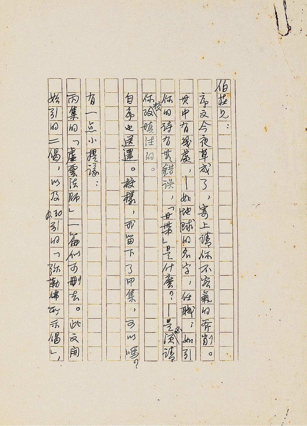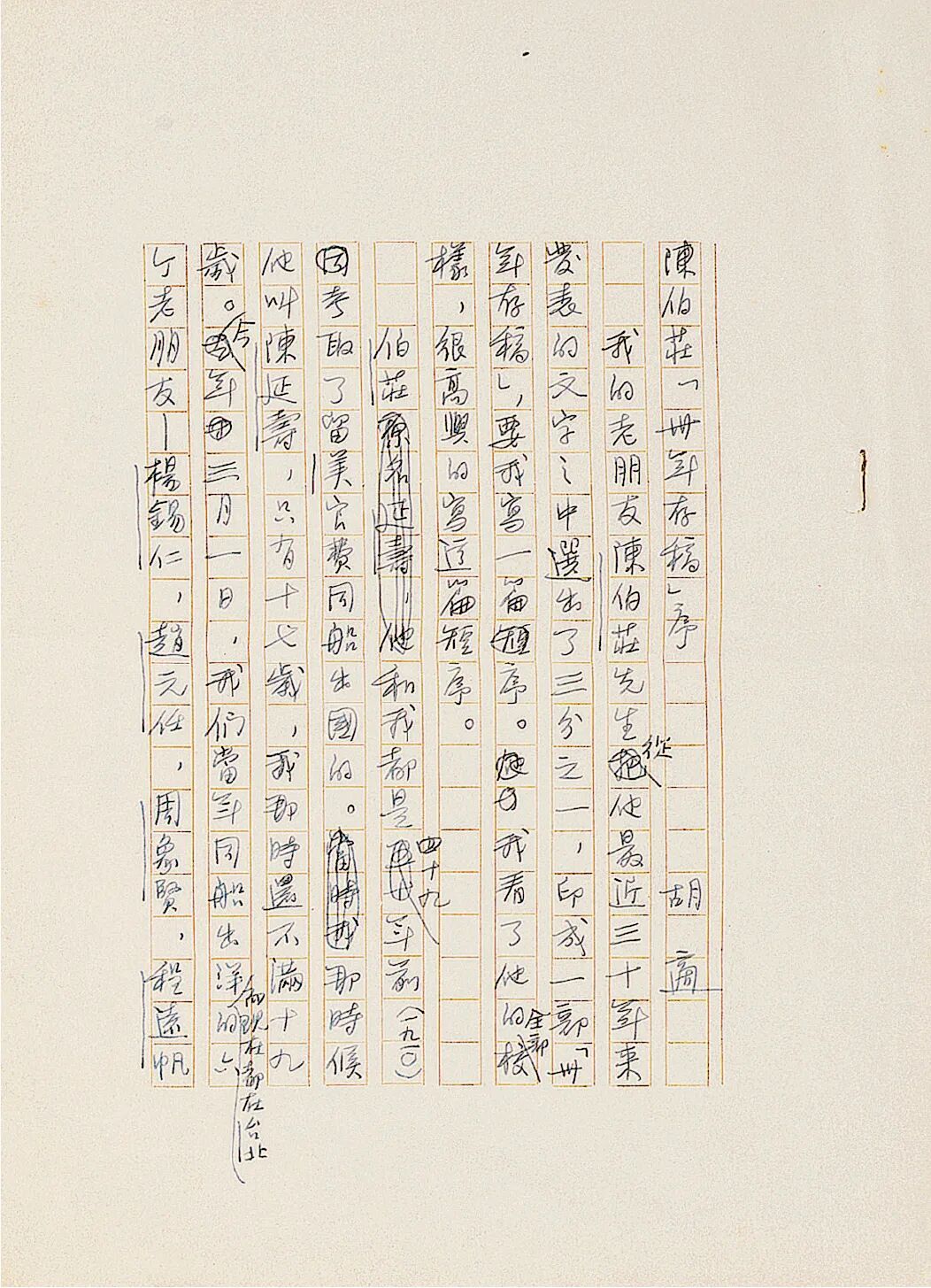 1959年5月31日胡适在台湾南港把写满十页原稿纸的手稿寄给香港陈伯庄,作为陈伯庄新书《卅年存稿》的序。陈伯庄1959年8月在香港自印《卅年存稿》。