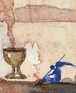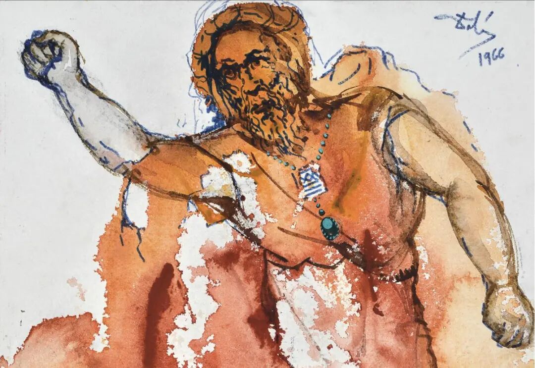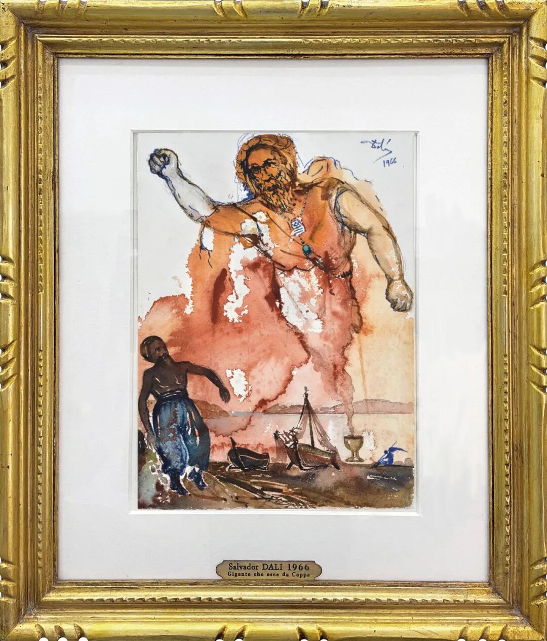 此作完成于1966年,那时达利已经年过六旬,艺术创作上早已炉火纯青、功成名就,迈进了艺术生涯最后一个阶段——也是他最不为人知而又值得探讨的一个阶段。这一年,他依旧成果丰硕——他生前最重要的个人回顾展在纽约现代艺术博物馆举行,由安迪·沃霍尔执导的达利短片也是在同年放映,而在两年前达利还刚出版了他的第二本自传《一个天才的日记》。在这一生中,除了创作油画,达利也从来没有停止过画素描和水彩,这三者的创作手法和艺术特点密不可分。《逃出杯子的巨人(渔翁和魔鬼)》源于达利纯熟的艺术技巧和超凡的想象力,在纸上得到全面绽放,此作同时告诉世人,神话典故作为“古老的超现实”,如何与以梦境和臆想为语言的“现代超现实”,重新碰撞出属于天才达利的绚烂火花。