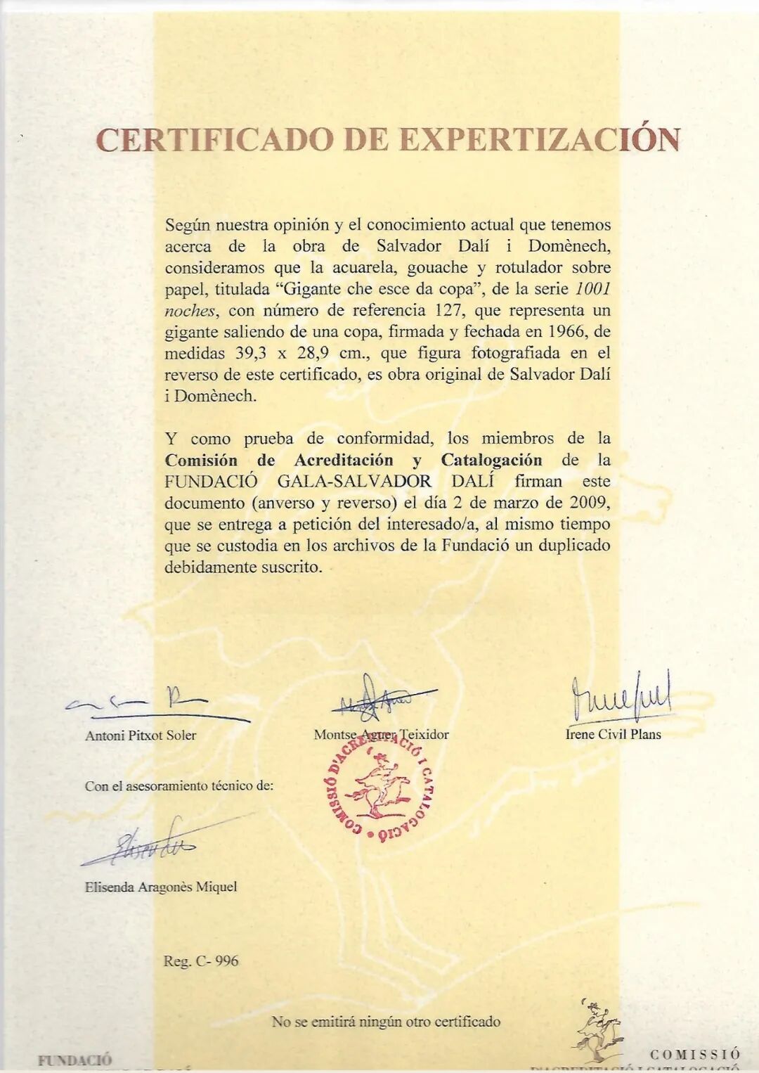 卡拉-萨尔瓦多·达利基金会鉴定及编目委员会认证证书