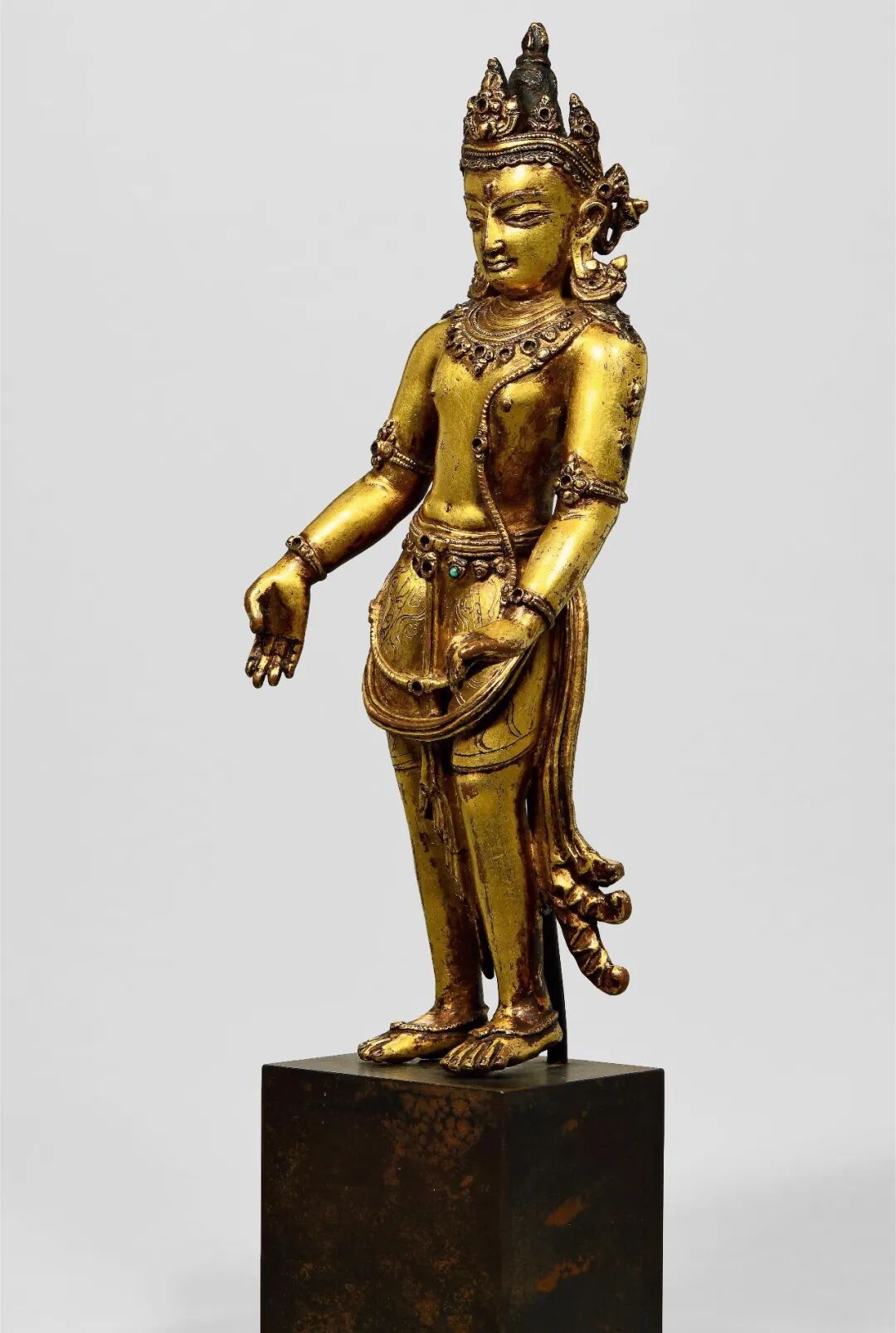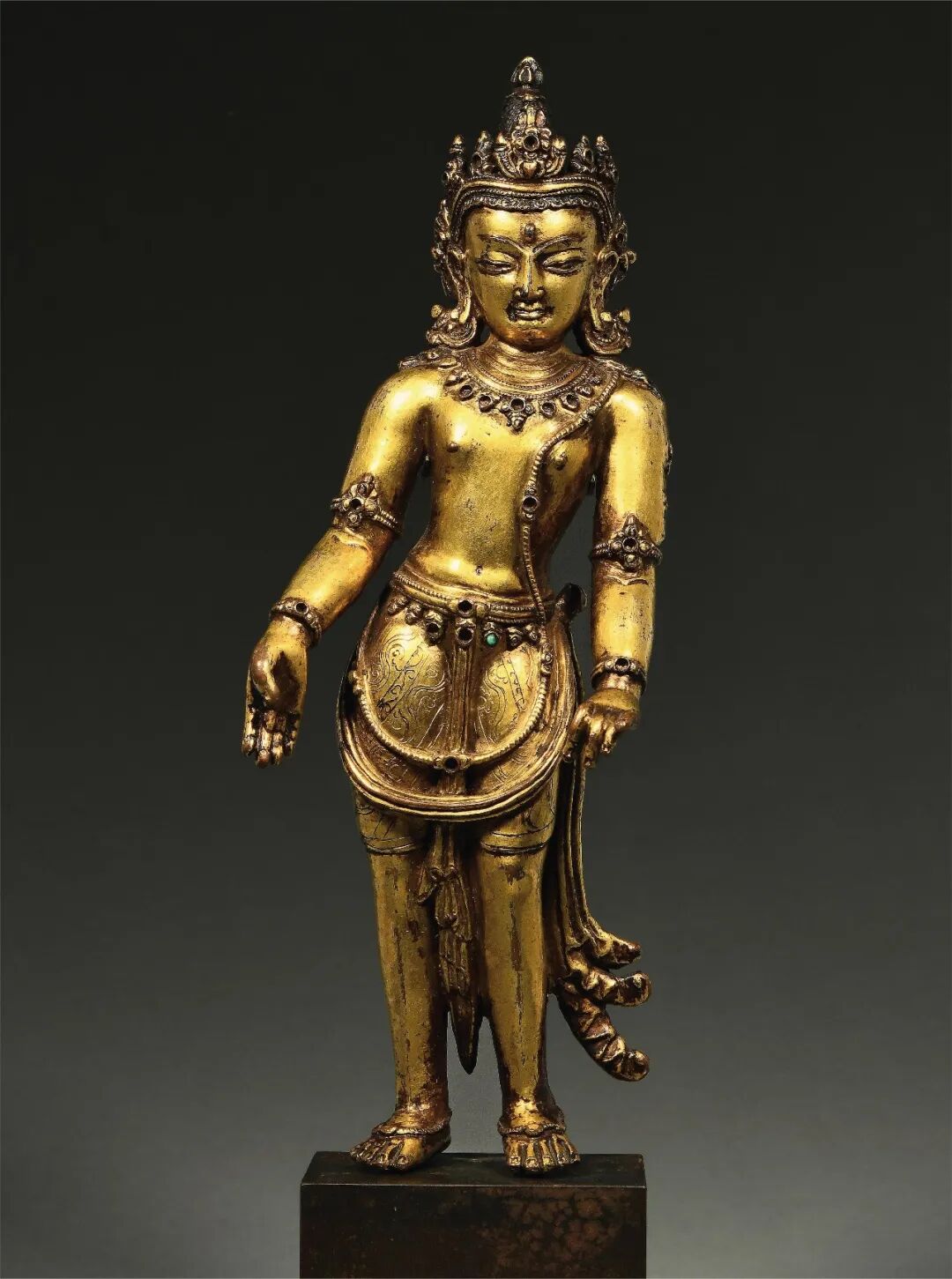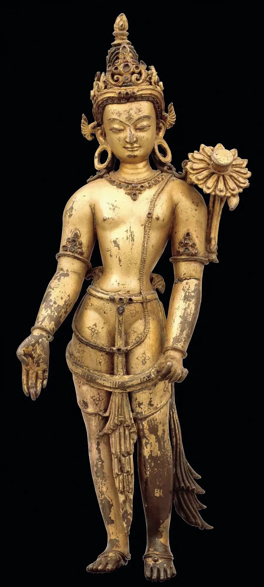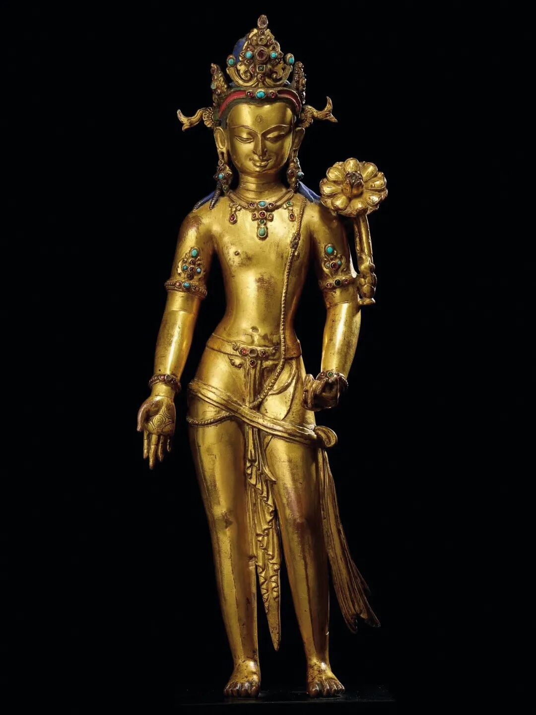 莲花手观音是观世音菩萨众多化身之一,因手持莲花而得名。其在藏地又有接引菩萨的作用,而本尊莲花手观音,其站立形态呈三折枝式,体态婀娜多姿。发髻高耸,余发披肩,头戴五叶宝冠饰。头部具圆融饱满之相,五官刻画精细端丽,工艺简练娴熟,应是成熟期的造像作品。嘴角微开,显露喜色,双目垂视,表情宁和、明朗,面容极为俊美。