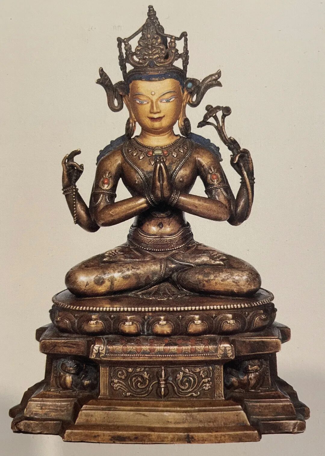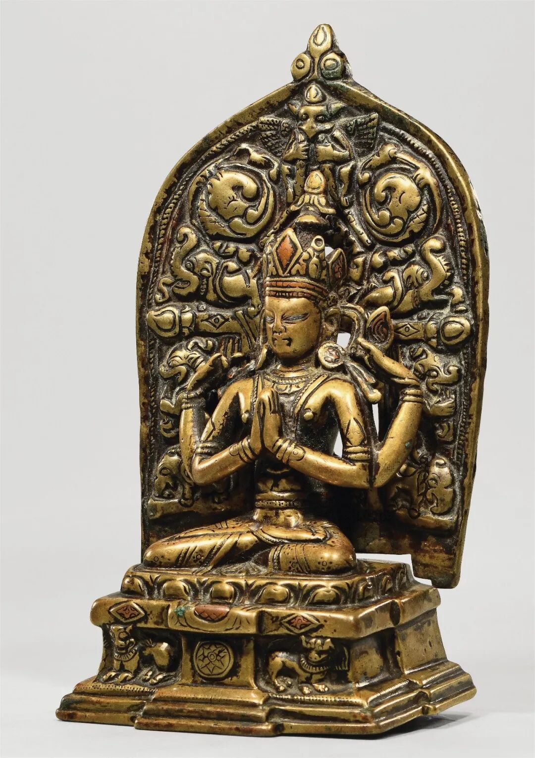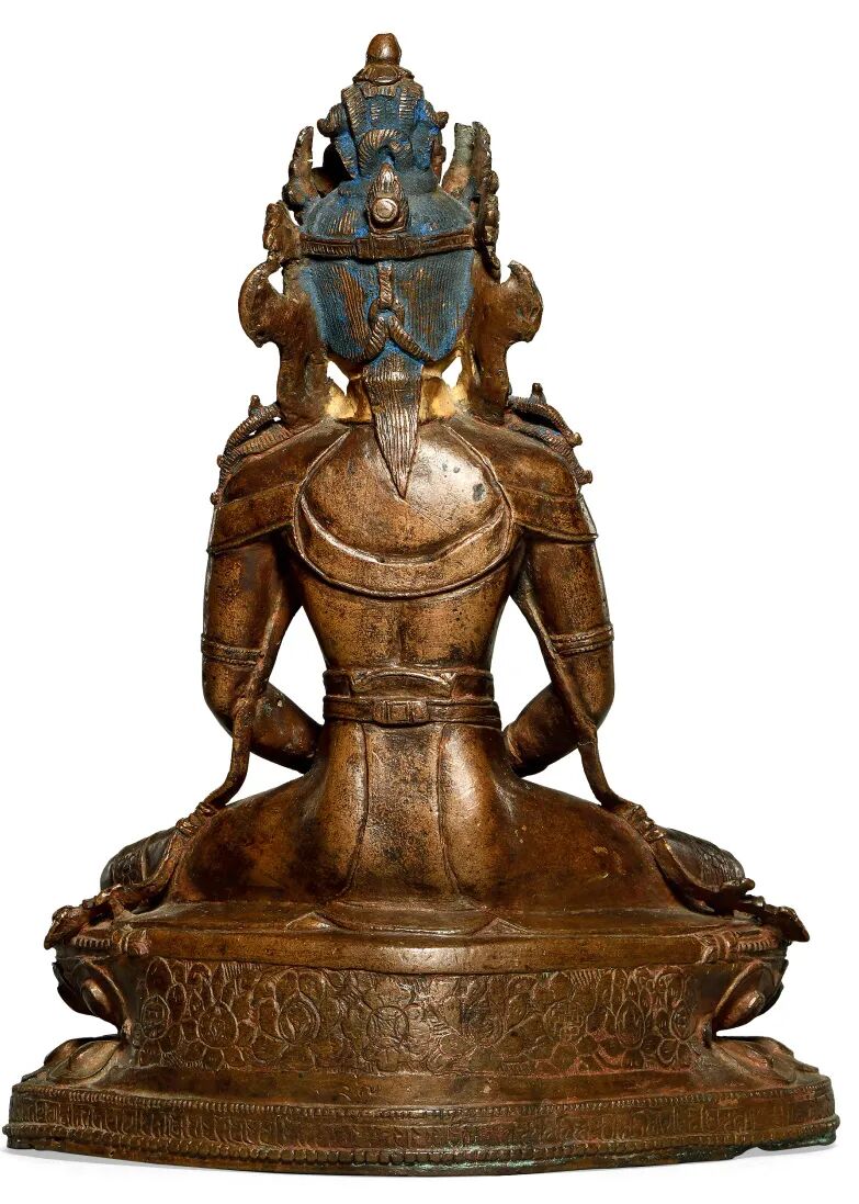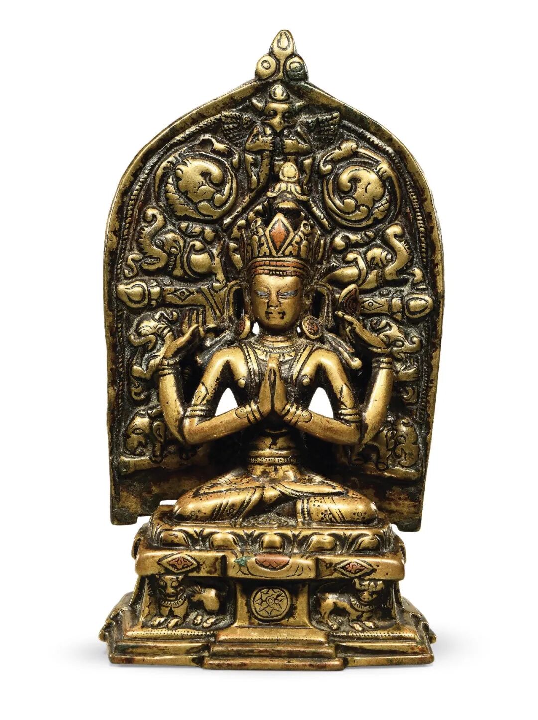 四臂观音为喜玛拉雅地区佛教徒普遍膜拜的神祇,从西藏后弘期开始,定型为以双手合什、另双手各持法器为形象,而印度早期的多臂观音形象并不固定,此尊形象殊为罕见。造像以上等合金铜铸造,质地细腻,经一千多年的供奉仪轨作用,以及收藏者多年的珍藏,可见其表面自然的磨蚀与润泽的包浆。此尊头戴花冠,发髻高耸,面庞丰腴,双目垂俯错有银质,相容寂静。上躯挺拔,身着天衣绸裙,佩饰项链钏环。主臂两手合掌于胸前,后二臂高举,全跏趺坐于仰覆莲台上,下承坛城宝座,左右各有一狮。背有舟形背光,顶部塑有一大鹏神鸟,下部自上而下分别有火焰、白象、十字宝杵、龙首纹样,此像虽不鎏金,但表层光泽莹润,采用两种铜质交错而制,小巧精致,令人爱不释手。
