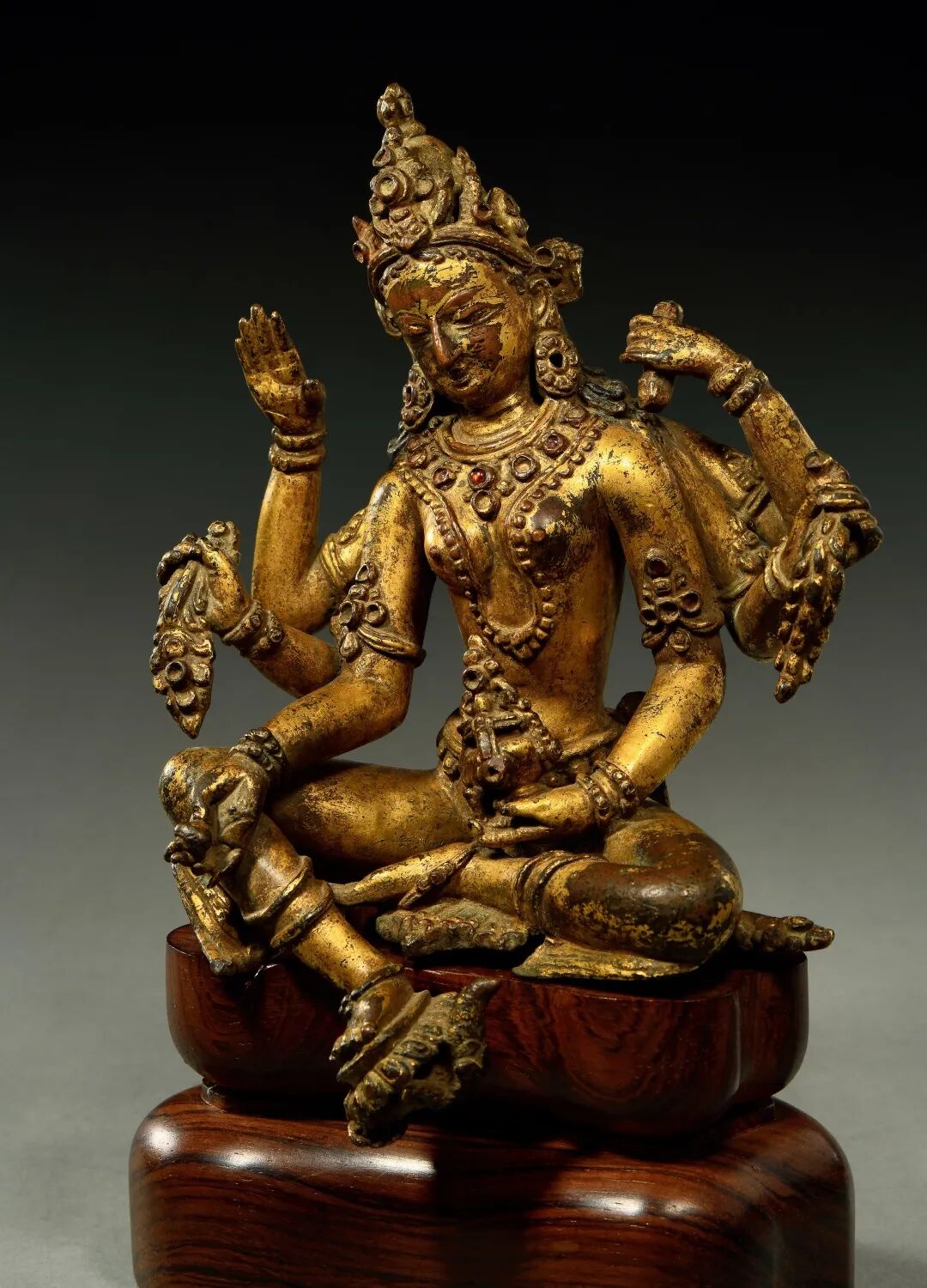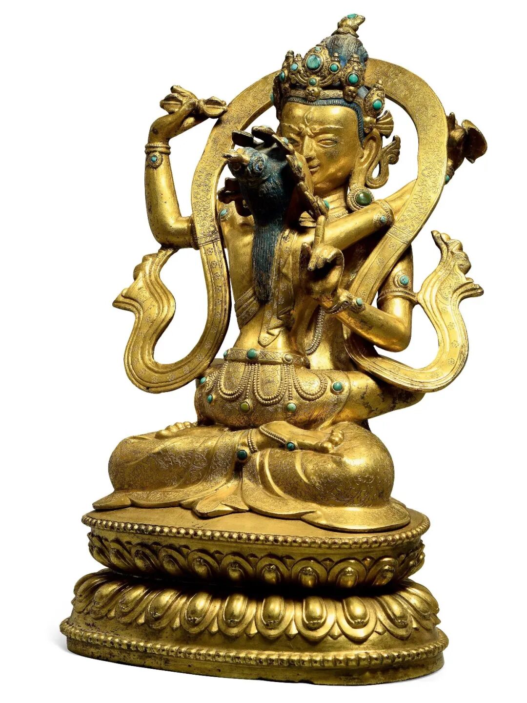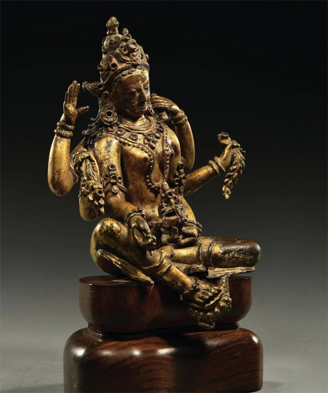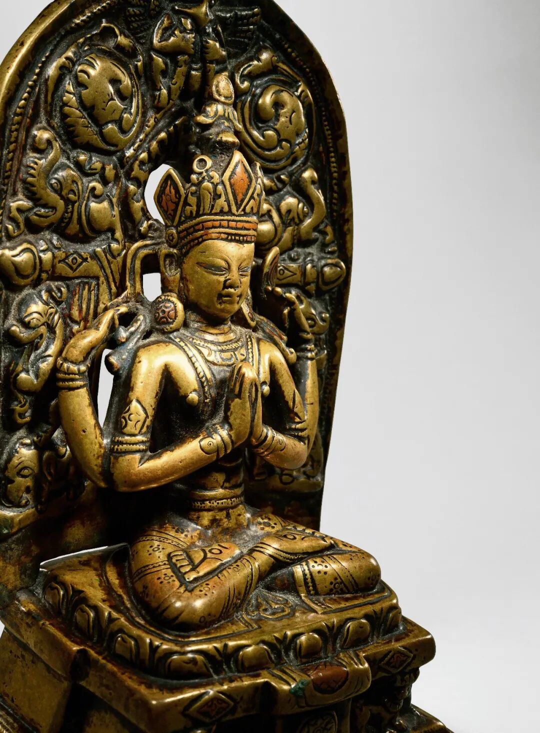 四臂观音为喜玛拉雅地区佛教徒普遍膜拜的神祇,从西藏后弘期开始,定型为以双手合什、另双手各持法器为形象,而印度早期的多臂观音形象并不固定,此尊形象殊为罕见。造像以上等合金铜铸造,质地细腻,经一千多年的供奉仪轨作用,以及收藏者多年的珍藏,可见其表面自然的磨蚀与润泽的包浆。此尊头戴花冠,发髻高耸,面庞丰腴,双目垂俯错有银质,相容寂静。上躯挺拔,身着天衣绸裙,佩饰项链钏环。主臂两手合掌于胸前,后二臂高举,全跏趺坐于仰覆莲台上,下承坛城宝座,左右各有一狮。背有舟形背光,顶部塑有一大鹏神鸟,下部自上而下分别有火焰、白象、十字宝杵、龙首纹样,此像虽不鎏金,但表层光泽莹润,采用两种铜质交错而制,小巧精致,令人爱不释手。