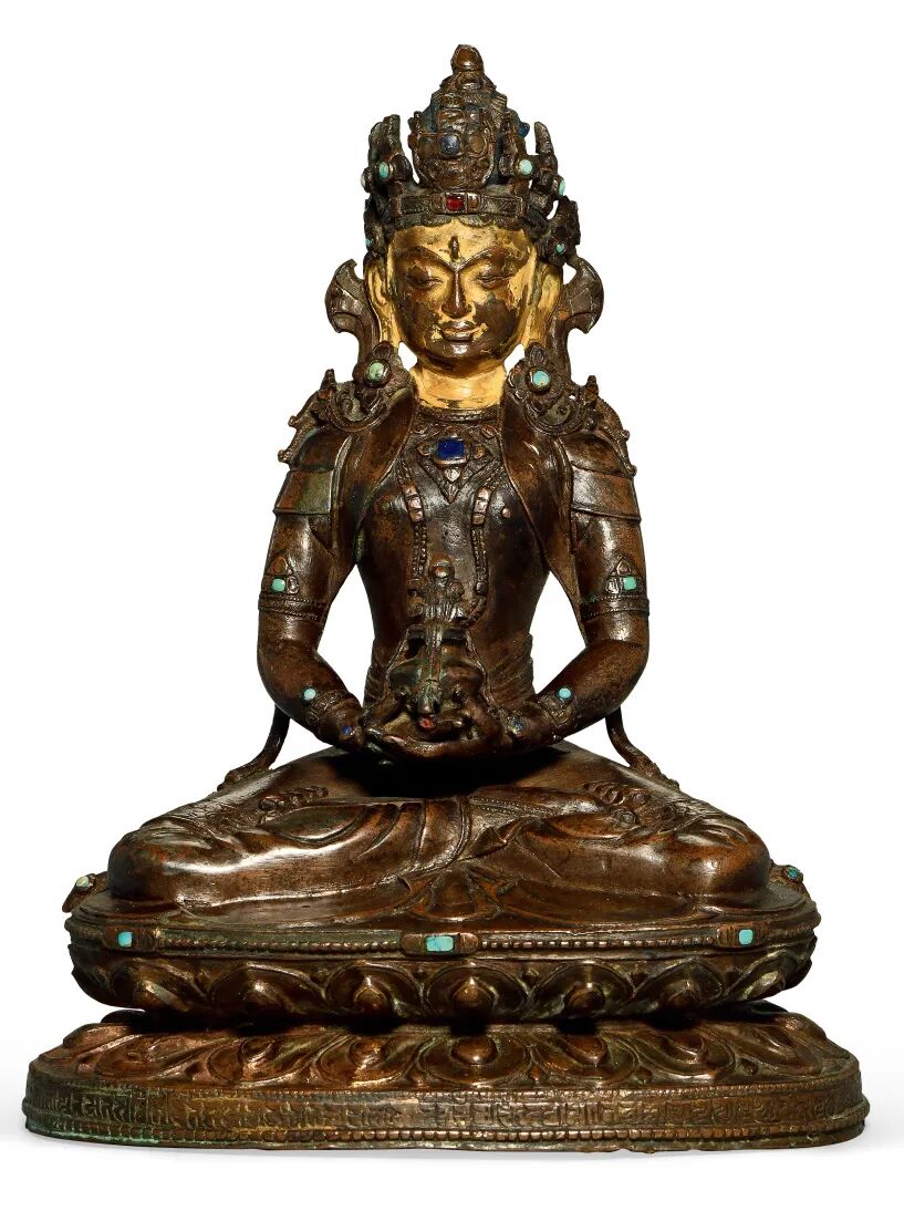 此尊双身金刚总持,头戴宝花冠,嵌有绿松石,顶结葫芦形发髻,余发束绺垂落于肩,宝缯于耳际飘拂,面容寂静。右手持金刚杵,左手结印拥抱明妃——金刚界自在母。金刚杵象征本尊所本有的不可破坏、最为坚实的“空”,即终极真理。明妃双腿盘绕主尊,双手上举。金刚总持是最高真实“空”的化身,明妃代表慈悲,双运相意味进入了空的境界,同时慈悲出现虚妄分别消失,这就是密教修行所达到的所谓悲空双运的最高境界。披帛高耸,围绕两尊而出,飘逸灵动,生动写实。下承束腰莲座,台座上下各饰有一道连珠纹,束腰式仰覆莲座上层饰连珠纹一周,仰覆莲瓣宽肥饱满,优美生动,制作细腻精致,时代风格鲜明。造像躯体比例准确,姿态生动优美,做工考究,堪称西藏造像精品。