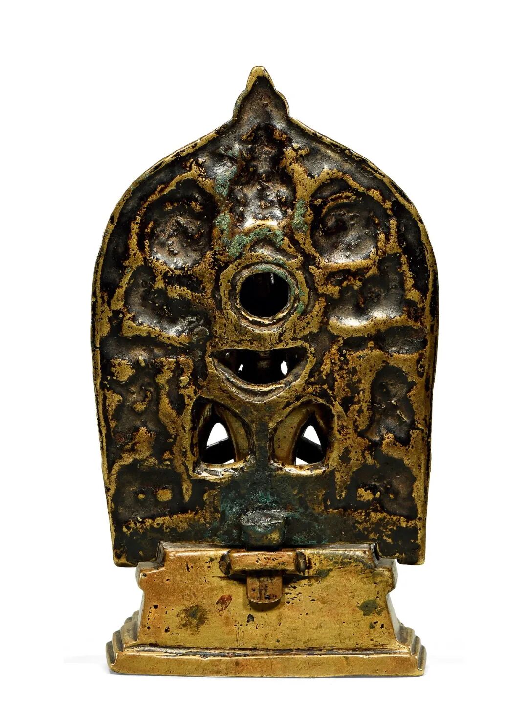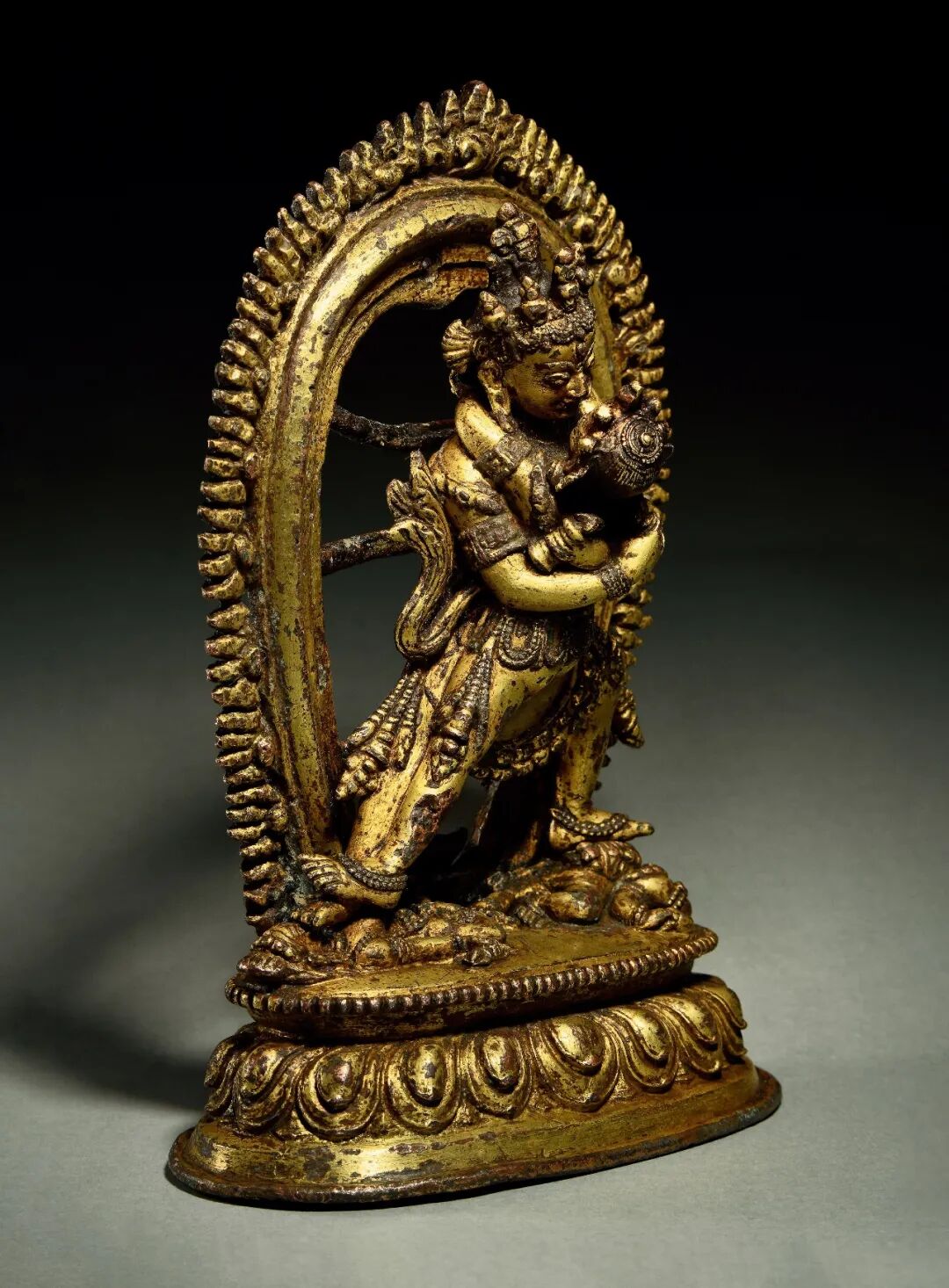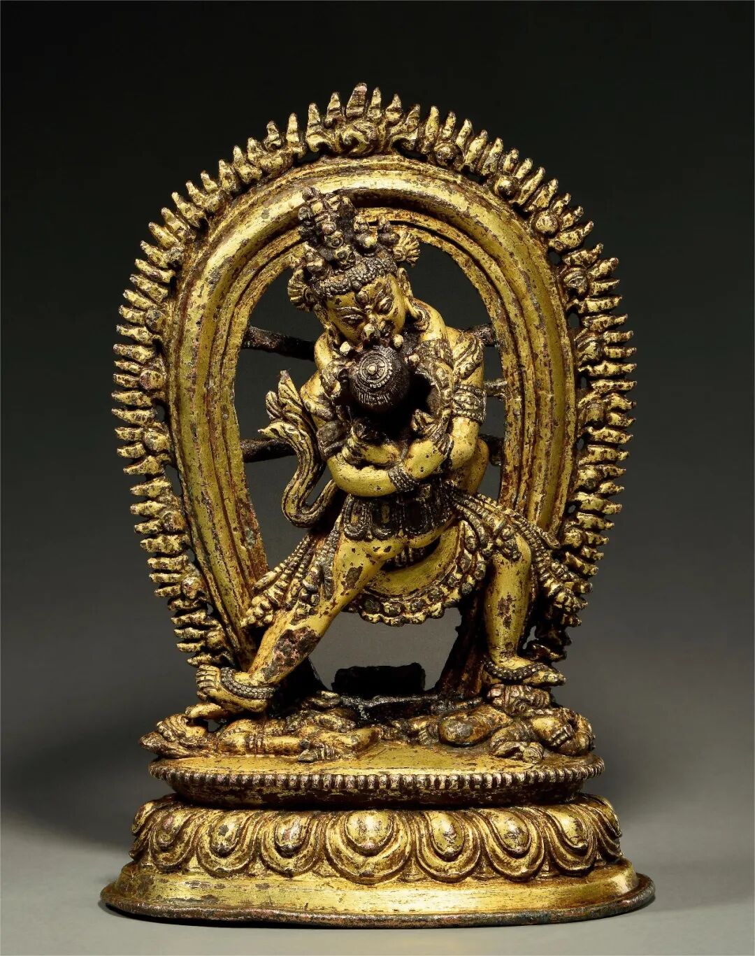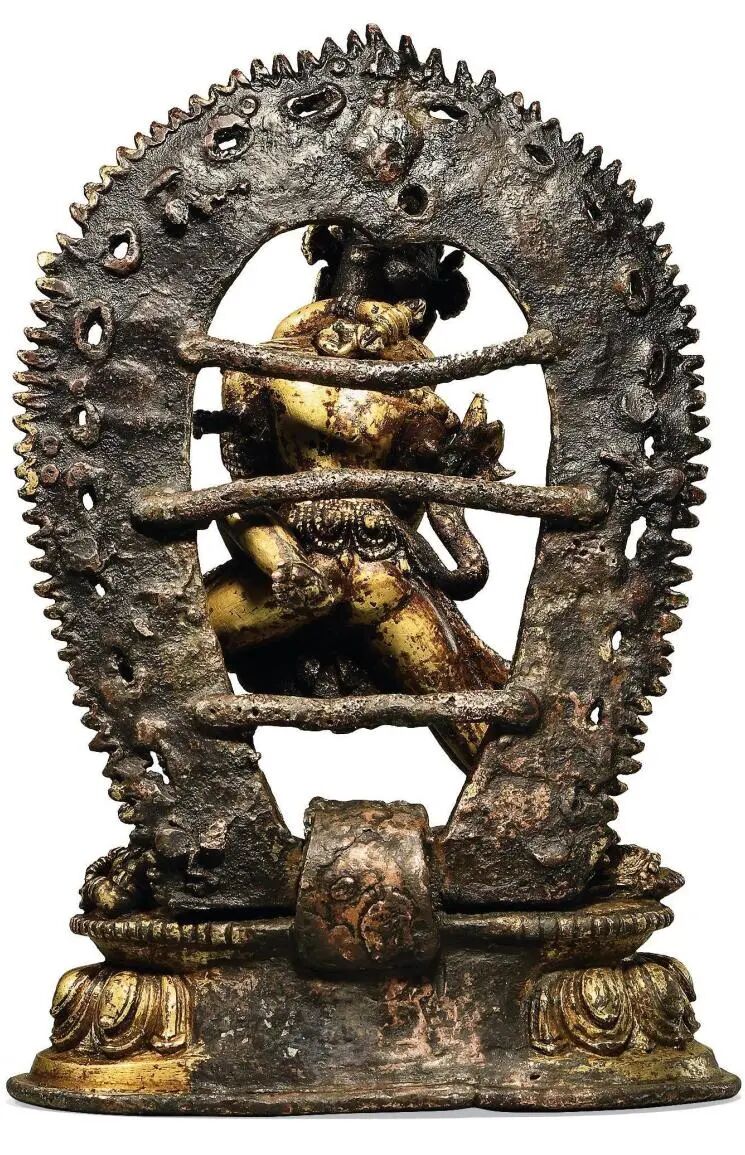 造像背部立有火焰舟型背光,鎏金醇厚。根据现有资料,存世的迦舍末罗造像主要为红铜(鎏金)以及银制,涉及题材并不广泛,绝大多数为释迦牟尼佛成道像,其余多见观音、文殊等菩萨,少部分为密教愤怒本尊,此尊即为其一。