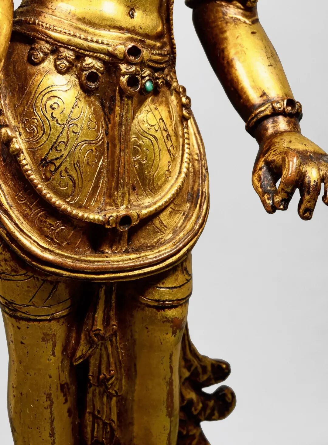 上身袒露,颈前饰璎珞,华美异常,长链披搭左肩而下挂身前,更显其整体婀娜多姿。左右弯曲结与愿印,掌纹刻画明晰而夸张。手腕及臂弯处,戴花形钏圈,华丽无比。腿部着碎花绸裙,轻薄贴体,衣纹錾刻极为精细,由有出水之感,尽显女性健美的肢体。
