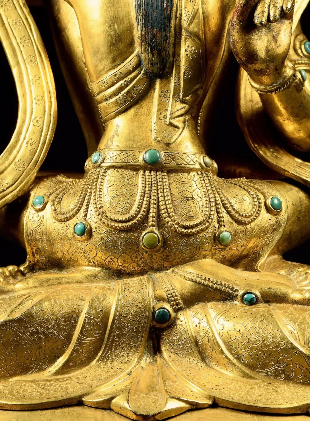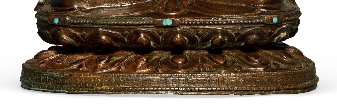 椭圆形莲台较为低矮,显得稳重大方,莲瓣大气舒展,瓣端微微翘起,挺拔有力。在莲台下方边缘錾刻一行兰扎体梵文,围绕莲台一周;在莲台上边有规整的连珠纹,间隔镶嵌松石,此装饰工艺非常少见。莲座后背的錾刻纹饰尤其特殊,作了细密的錾刻纹饰,布局合理,毫厘之间尽显工匠技艺之娴熟,用刀之老辣。此纹饰设计源自于宋代中原瓷器的装饰图案,至元明时期发展为宫廷服饰文纹样,后随前文提到的皇家赠礼传入藏地,深受高层人士所青睐。