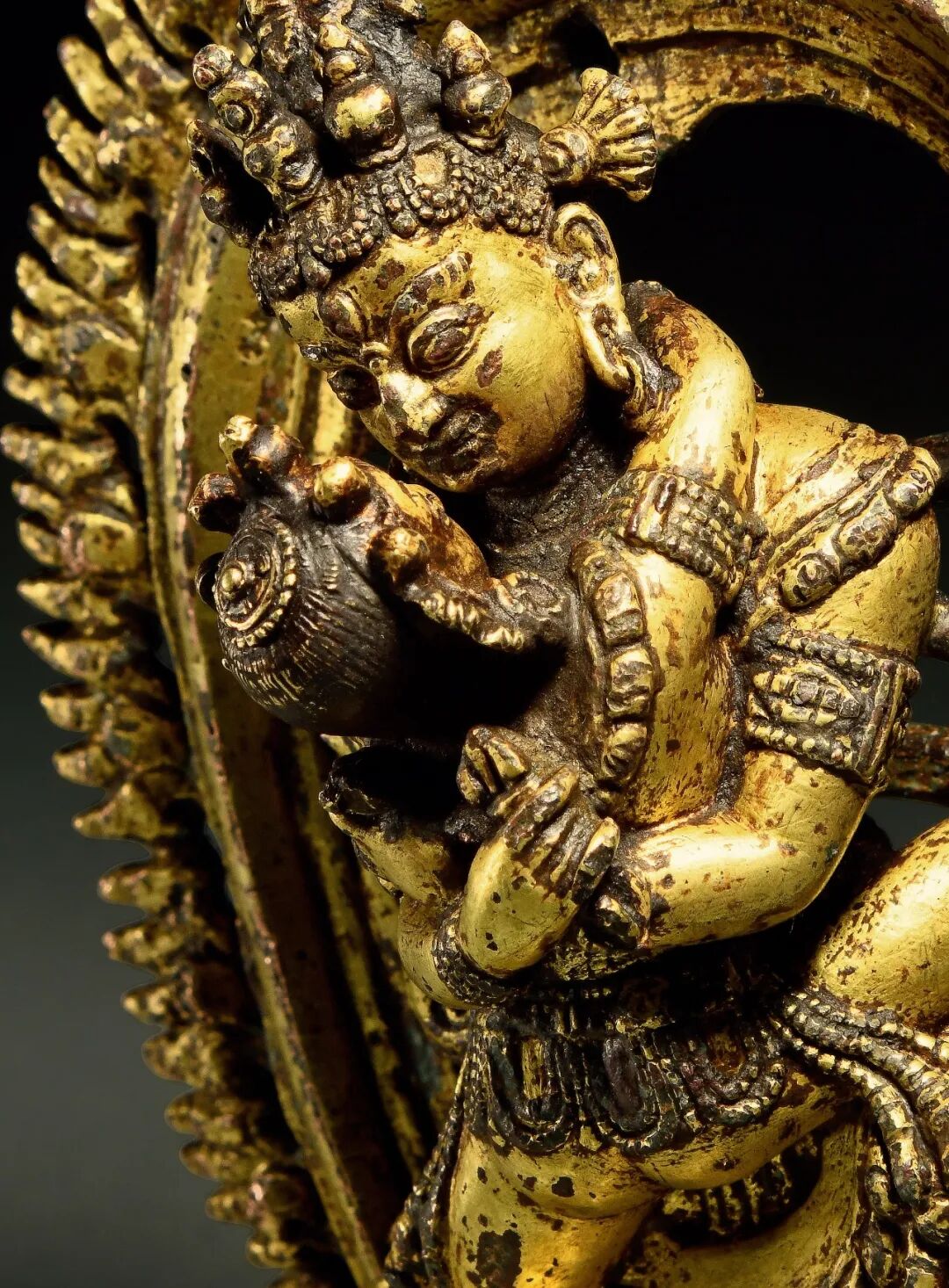 迦舍末罗(Khasa Malla)王朝,是喜马拉雅地区文化史中一个存续时间极为短暂、同时亦存在诸多待解问题的特殊时期,是一种附属纽瓦尔风格的艺术作品,同时也融会了印度或藏西的艺术风格。我们一般会通过伊恩艾尔索普(Ian Alsop)的观点来辨别:1. 四肢指节关节处的刻画和强调;2. 红铜鎏金;3. 背后莲座留白处的红漆。结合以上论述,此尊上乐金刚正是一风格特征明显的迦舍末罗晚期造像佳作。