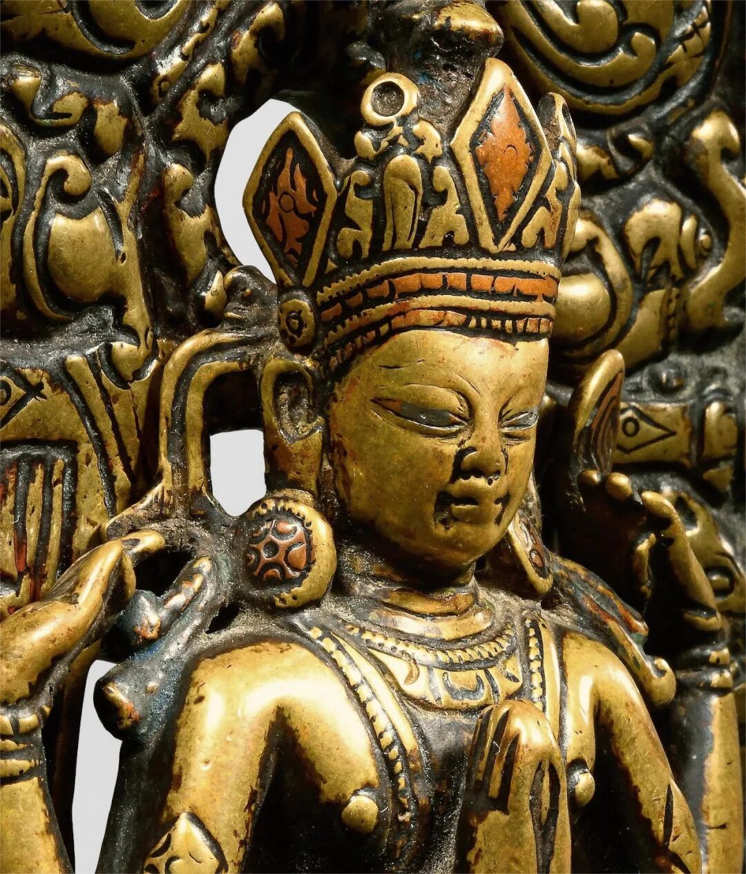 其中最为特殊的是观音的眼睛和白毫,均以打磨精细的纯银和红铜错嵌,一点点铸成,熠熠生辉,充满神彩,符合克什米尔传统,这便是著名的“古格银眼”,展现了当时古格王朝精湛的金属制造工艺。