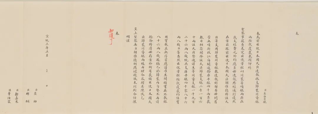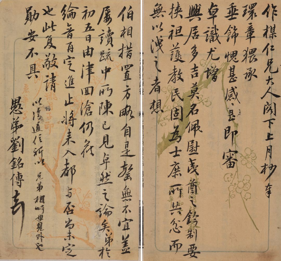 提要:此为刘铭传致陈鼐信札,1通2纸。信中刘铭传对陈鼐才干颇为赞赏,并“以后通信祈以兄弟称相呼,毋见外也”。上款人简介:陈鼐,字作梅,号竹湄,江苏溧阳人。道光二十七年进士,同年进士有李鸿章、沈葆桢、郭嵩焘等。曾国藩言此人极善看地,曾请他为家族看地。官至直隶清河道。作者简介:刘铭传(1836-1895)安徽合肥人,字省三,号大潜山人。咸丰初在乡办团练,屡从湘军作战。同治元年,从李鸿章到上海,所部为淮军“铭字营”。下奉贤、金山卫,解常熟围,破江阴、常州,自千总累擢至提督,继程学启为淮军大将。后从曾国藩、李鸿章镇压东西捻军。中法战争时,督办台湾军务,屡与法军交战。台湾设省后任巡抚,在台七年,修炮台,造铁路,设电线,开煤铁矿,举办新式学堂,多所建树。后乞病归。卒谥壮肃。有《奏议》及《大潜山房诗稿》。提要:此为宋晋致陈鼐札。语涉铭军营务、山右河防、西陲回务、湘军等军事,及治军识人等事务。作者简介:宋晋(?-F1874),字锡蕃,江苏溧阳人。道光二十四年进士,选庶吉士,授编修,擢侍读学士,迁光禄寺卿,擢内阁学士,迭署户、工二部侍郎,授工部侍郎,迁户部侍郎。十三年,卒。提要:钱振常信四通,皆致沈玉琪者,其中提到“礼闱揭晓”,问询其侄子是否登榜,又提到户部原奏查看,“因经翁处有好友要看,当即送还阁下可至经翁处一看便知”,以及请求沈玉琪赠其方于鲁九子墨二笏等事。作者简介:钱振常,吴越国王钱镠之后。清朝末年人,原籍浙江吴兴(清湖州府归安县)。曾官礼部主事,晚年为绍兴、扬州书院山长;又在苏州工作。有子二人,长子钱恂,号念劬,外交家。上款人简介:沈玉琪,字旭初,室名味似斋,清光绪间浙江海盐人,曾任电报局总办。沈锡华子,沈能虎兄。与钱振常、陈德球、余觉往来。提要:钱振常信,一札云送上宣南友人所刻诗集一本,如已经收到,请转赠沈能虎。“欲雨后诣访,如此酷热,颇怯步耳。”另一札则告知沈玉琪科举考试中榜举子的一些情况,另一札则送上角花笺五幅,并且介绍说纸已陈旧,是百余年前物,适宜书写,可以作册页首幅之用。且其花纹凸起,装裱时需要良工才能维持原状,可见其珍爱之情。提要:宣统三年朱批知道了关于出使日本国大臣造报收支归装折。带原封。