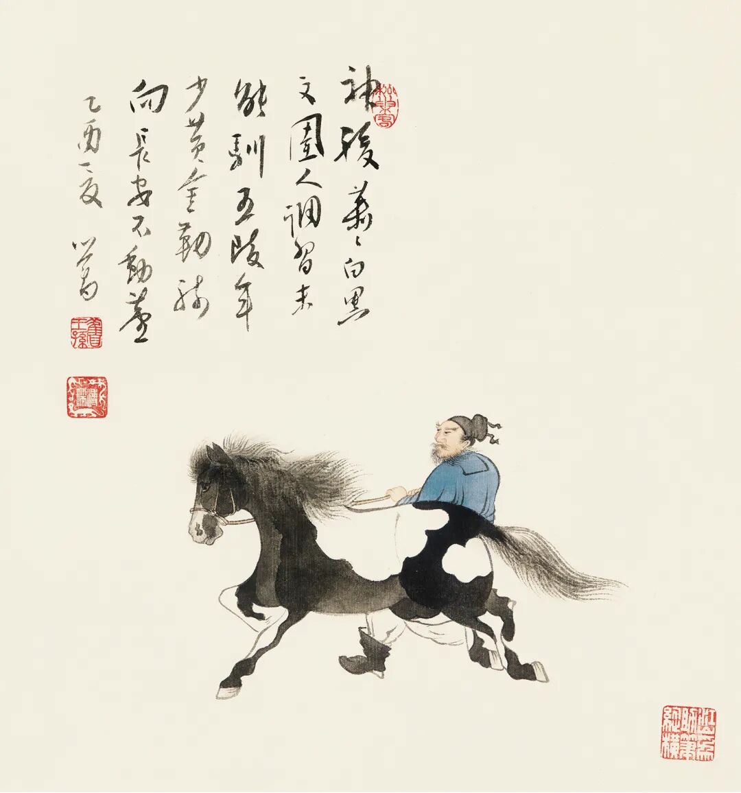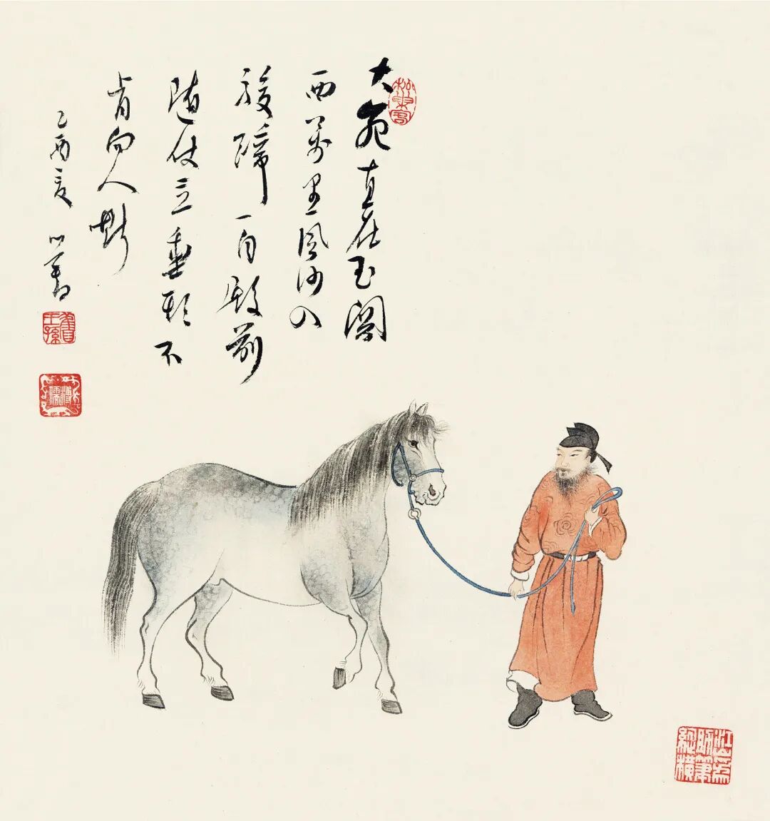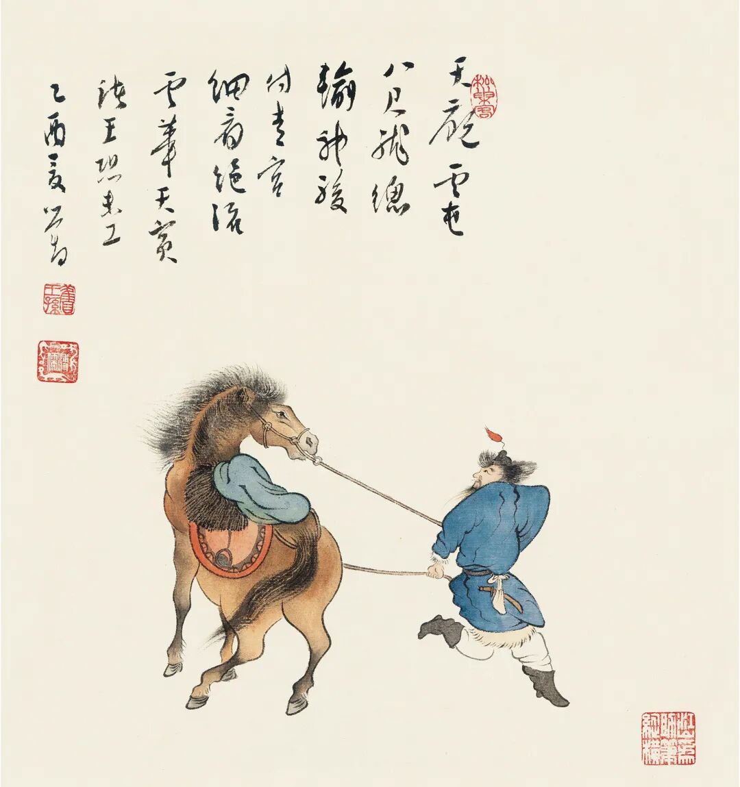 溥儒擅长画马,他取法高古,不仅造型准确,而且非常有力,肌肉饱满,力量感十足。如此四帧鞍马小品,尤为注重骏马与戎人的动态关系,骏马或奔腾疾走,或昂首嘶鸣、四啼腾骧,似欲挣脱羁绊。与之相应的是,牵马的戎人也姿态各异,神情动态尤为生动。