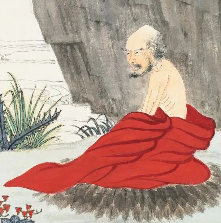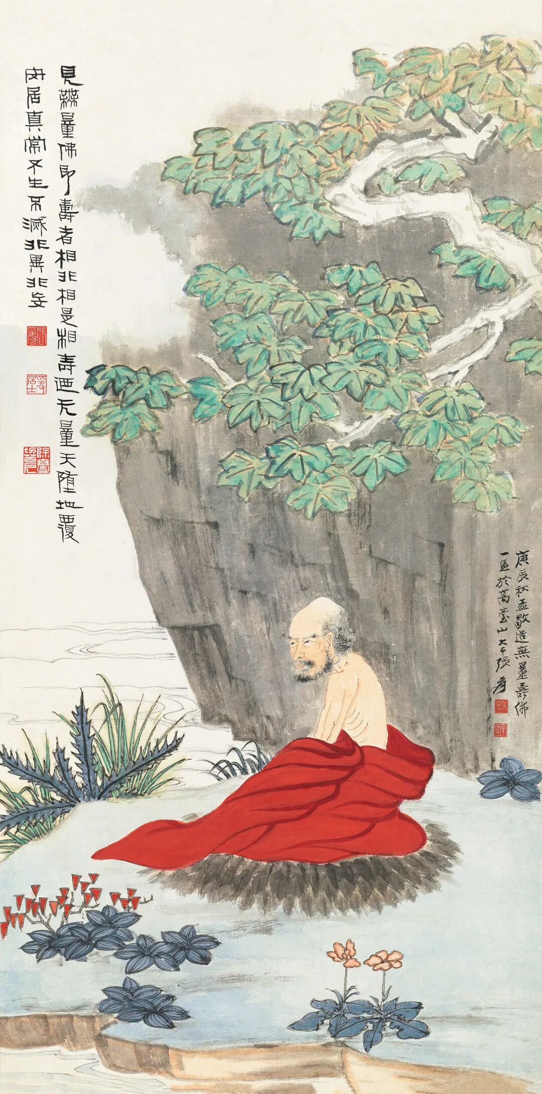 此幅《无量寿佛》作于1940年,画上题“敬造无量寿佛一区于高台山”,高台山即青城山第一峰绝顶。画中无量寿佛侧身盘坐于蒲团上,面相清癯肃穆,浓鬓卷发,袈裟半披,露出瘦削见骨的身躯。后方背景中山石壁立,上端为云雾所掩,下临坡岸与溪流,一枝梧桐自右方探入画中,阔大的树叶纷披舒展,状若华盖,坡岸间围绕佛像点缀以各类花草,渲染出如净土般庄严宁静的气息。画面左上方以带有金石韵味的隶书长题佛理,右方则另用行书题作画时间及名款,与画面融为整体,并突出主题。