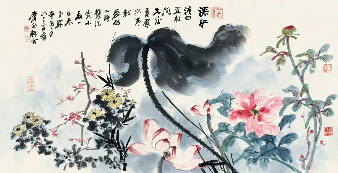 大千曾谓:青藤花卉,逸韵过白阳,石涛、八大,莫不专之。本幅即师法徐渭,取四时花卉合为一卷,一派生机、韵致超逸、远近扶疏、参差掩映,皆布置井然。画面上景物舒展自如,高低起伏,摇曳生姿,互起呼应,季节区隔,秩序自生,切合物情、物态、物理之自然法则,充分展示了他在传移模写与位置经营等方面的非凡笔墨技巧和绘画能力。而独创的泼彩、泼墨法又极具现代性和抽象感,其出神入化之笔不仅已打通了古今,也跨越了中西,成就了绝代风华一大千。