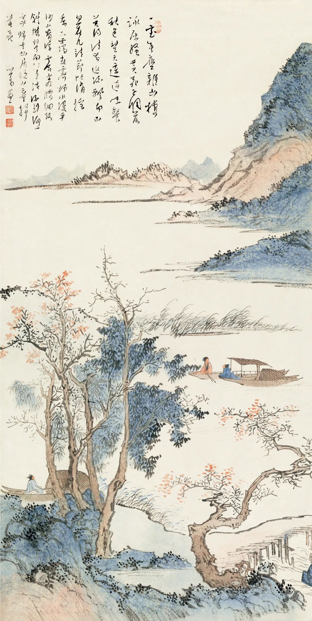 比如下面这幅山水,图绘秋日之景,远处山远朦胧,一窄桥横跨二山之间,桥下水流湍急,桥下船影绰绰,近处树木枝曲叶稀,秋色浓烈,潇洒自如,从心所欲,如入化境。