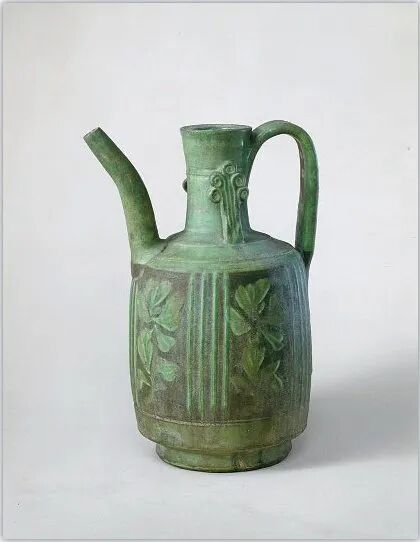 1.国立故宫博物院1989年出版,《海外遗珍 续 HAI-WAI YI-CHEN》P87 85,辽 绿釉贴花花卉纹水注,瑞典辽东古物馆(Museum of Far Eastern Antiquities,Sweden)藏。长颈,圆腹,圈足。壶体壹侧有弯曲的流,另一侧为扁宽形柄,颈部两侧对称贴塑花纹。腹部减地剔刻折枝花卉并由四条竖道间隔出五组开光。凸显浅浮雕的艺术效果。通体施以翡翠玻璃釉,肥厚温润亮泽。具记载20世纪80年代在四川广元瓷窑铺窑址曾采集到与此壶相类似的瓷片标本,应为四川广元窑器物。广元窑充分吸收南北制瓷工艺,并创新,绿釉和黄釉最为优质。此执壶既有北方磁州窑装饰特点,又有南方灵动秀雅的气韵,存世量少,为古瓷珍宝。