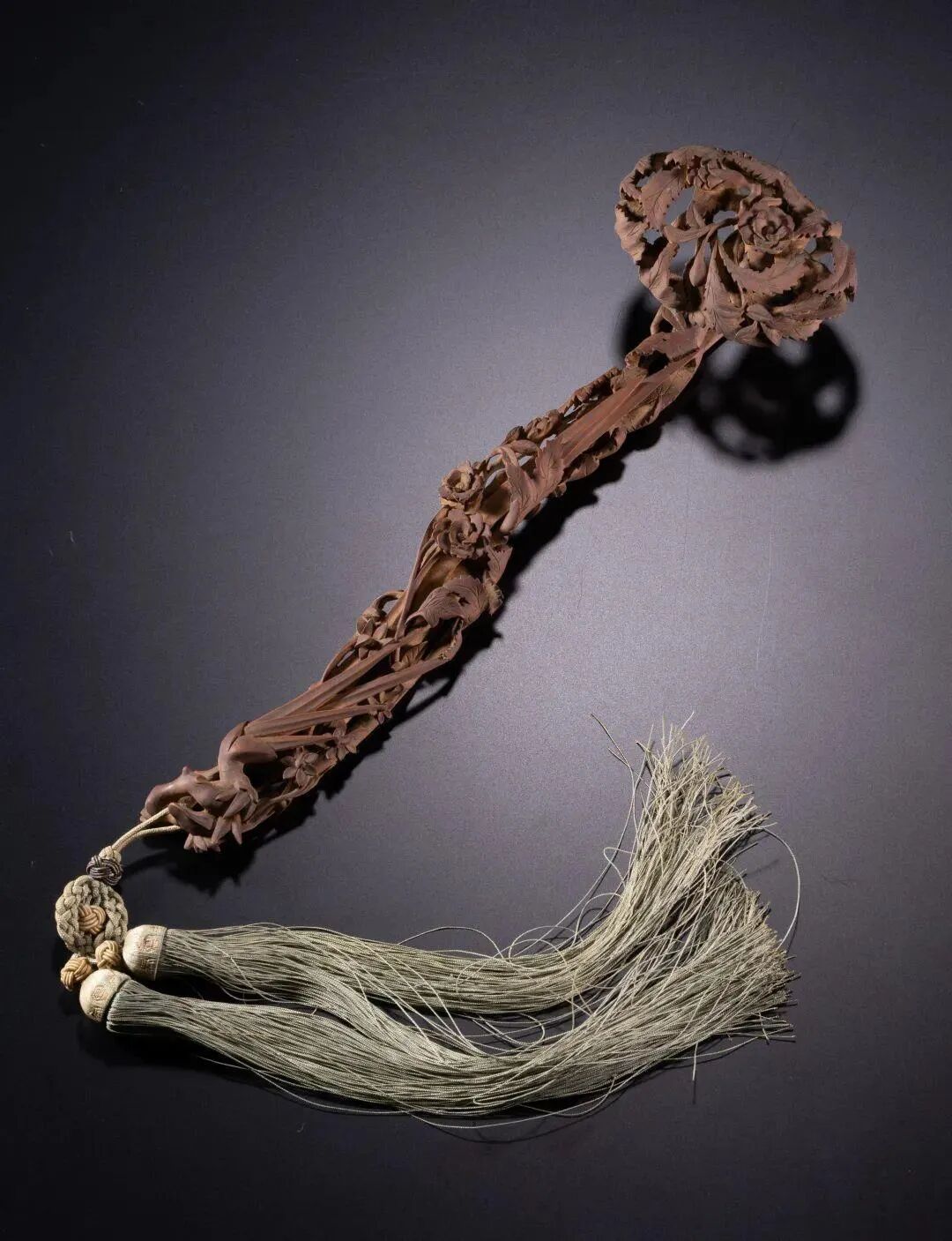 「如意」又有称心如意之意,晚明文人笔记中有得天然树枝、竹鞭,不事琢磨而为如意,并视如珍宝的记载。乾隆皇帝认为「制成如意多,最嫌俗样巧」,依旧对竹木类如意情有独钟。清代的皇帝、皇后还常用如意作为赏赐王公大臣之物。另有记载,在清代的进贡制度,必有黄杨木如意,可见黄杨木如意在清宫珍宝库中具有不可取代的地位。纵观中华艺术宝库,茶花水仙的纹样题材在竹木如意里应为罕见,历代书画家们则有此画稿表达白茶花与水仙为朋,纤尘不染、纯洁无暇的文人境界。此柄如意设计大胆,巧雕,镂雕及浮雕相结合,主干屈曲蜿蜒,水仙缠绕,叶姿秀美,如意头上山茶枝叶翻卷自如,花开似锦。瘿瘤、蛀洞剜镂而出,均状若真物。天工巧匠也为感叹。此类黄杨木雕如意,于清宫旧藏中亦可见数例,但镂雕如本品这般繁复精致者相对少见。北京故宫博物院藏品中,一套九如如意的其中一件黄扬雕如意同为镂雕工艺,造型、雕刻手法与此器风格相同,可兹比较。