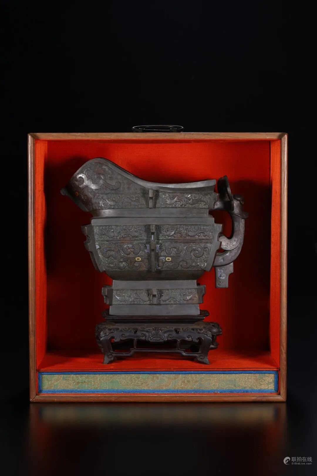 青铜器的制造在我国有着源远流长的的历史,「国之大事,在祭与戎」, 纵观殷商、秦汉唐等盛世,祭祀、朝礼,征讨等国家大事都以举国之力铸造精美的青铜器。此器曲口流槽,后部有曲耳兽首半环形鋬,勾眉凸睛,翘鼻阔面,叶状招风双耳,兽角向内卷曲,形似牛角;饕餮纹正中有一道扉棱为鼻梁,颈部、足墙腹部装饰凤鸟纹与饕餮兽面纹。整器均以雷纹为地,层次分明,外壁满饰浮雕,立体感颇强。宋朝是物质文明和精神文明极其发达的时期,著名史学家陈寅恪说:「华夏民族之文化,历数千载之演进,造极于赵宋之世。」此藏品采用了大面积的错金银工艺,既有仿古商周之气韵,又有工艺细致奢华的精美,为宋朝尚古之佳作。