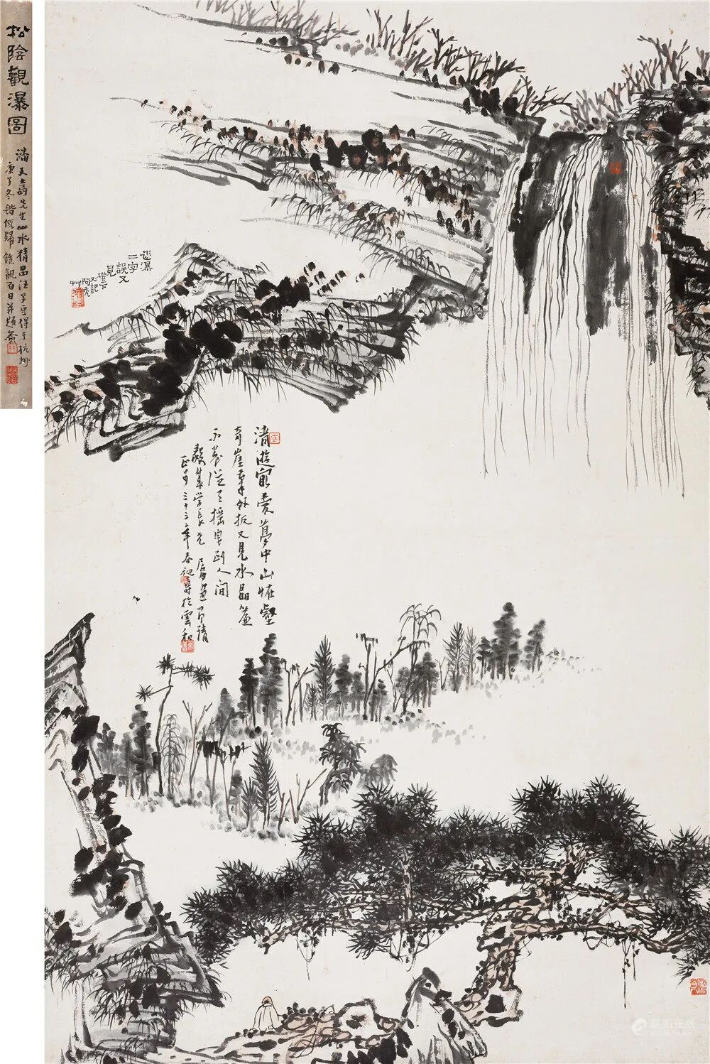 “龙湫野瀑雁荡云,石梁气脉通氤氲。久久气与木石斗,无挂碍处生阿寿。”这首诗是1923年吴昌硕见到潘天寿的画作后亲自为其所题,似乎精辟的总结了潘天寿一生的艺术生涯,而这首句诗文用来形容《松荫观瀑》再合适不过,将这件作品的意境、气韵、格调体现的淋漓尽致。