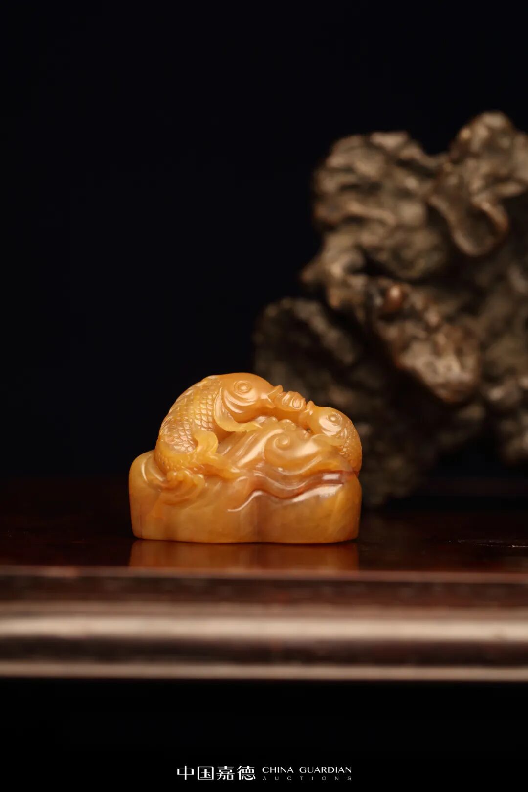 此鱼钮章以寿山田黄石为材,其石质细嫩,略有红色石筋蜿蜒,首部圆雕双鱼戏珠,鱼鳞层层,密而不乱,鱼身扭转,甩尾之姿,水浪翻涌,双鱼口顶火珠,有祥瑞之兆。