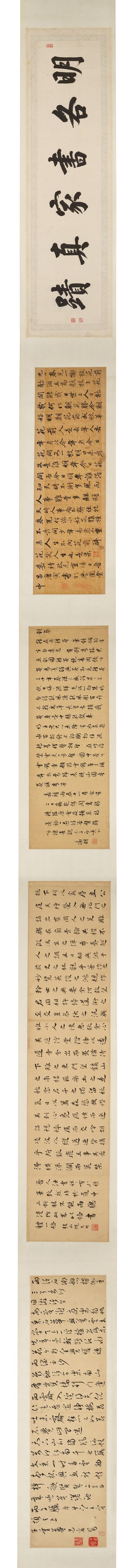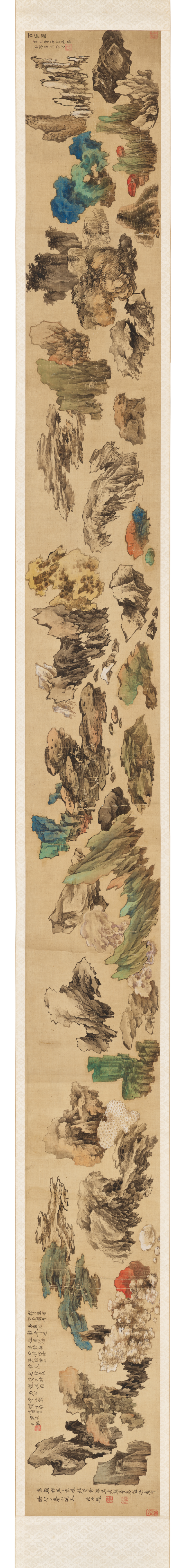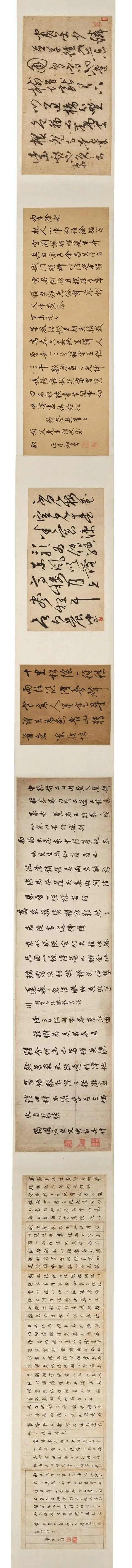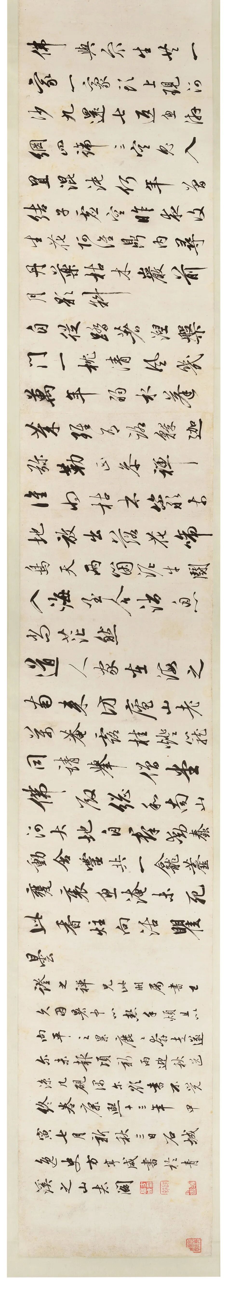 祁豸佳,字止祥,号雪瓢,山阴人。天启举人,明代遗民,清代履聘不应,隐梅市卖画代耕。史论祁氏「书学董其昌,而缺其秀劲」,然观本幅浩浩七米长卷书李白诗,铁画银钩气势摄人,潇洒淋漓笔力挺拔,自有一种不可羁勒之概,吴昌硕谓其「忠义之气集于毫端」,另辟法门,又何须学古人。本幅经吴昌硕、长尾甲题跋,藏于山本悌二郎「澄怀堂」并著录于其书中,流传有序,识者宝之。