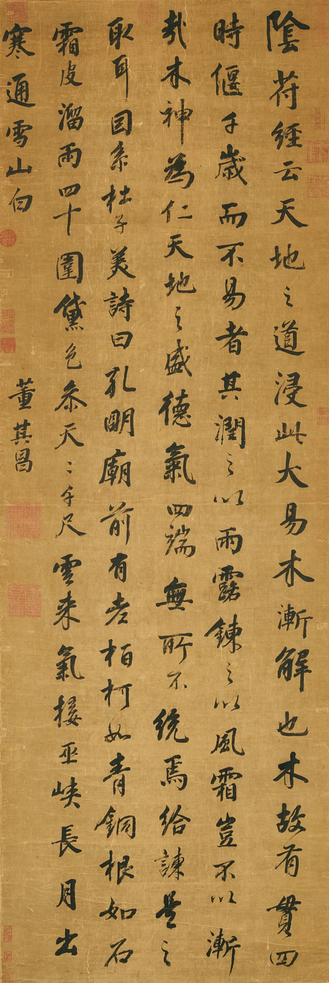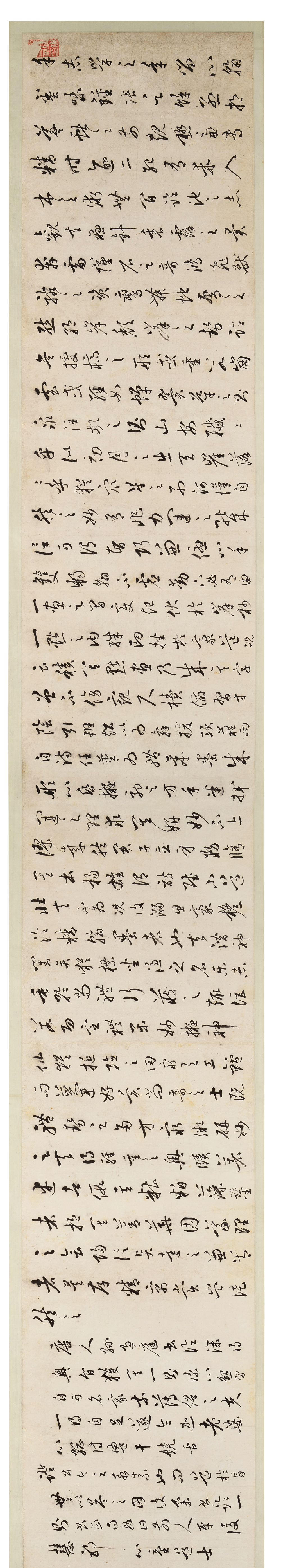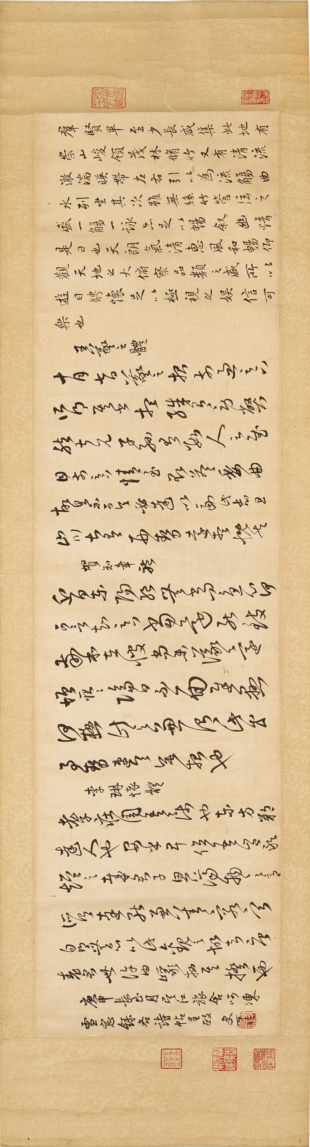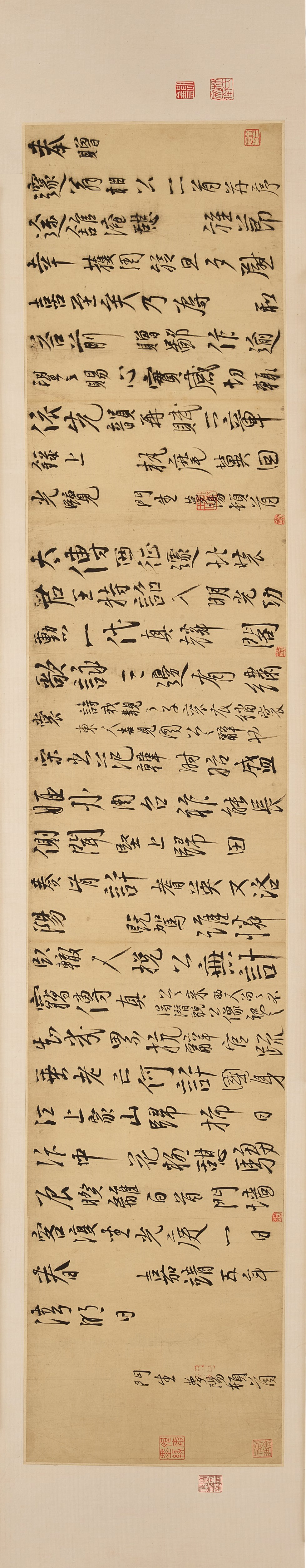 祁豸佳,字止祥,号雪瓢,山阴人。天启举人,明代遗民,清代履聘不应,隐梅市卖画代耕。史论祁氏「书学董其昌,而缺其秀劲」,然观本幅浩浩七米长卷书李白诗,铁画银钩气势摄人,潇洒淋漓笔力挺拔,自有一种不可羁勒之概,吴昌硕谓其「忠义之气集于毫端」,另辟法门,又何须学古人。本幅经吴昌硕、长尾甲题跋,藏于山本悌二郎「澄怀堂」并著录于其书中,流传有序,识者宝之。