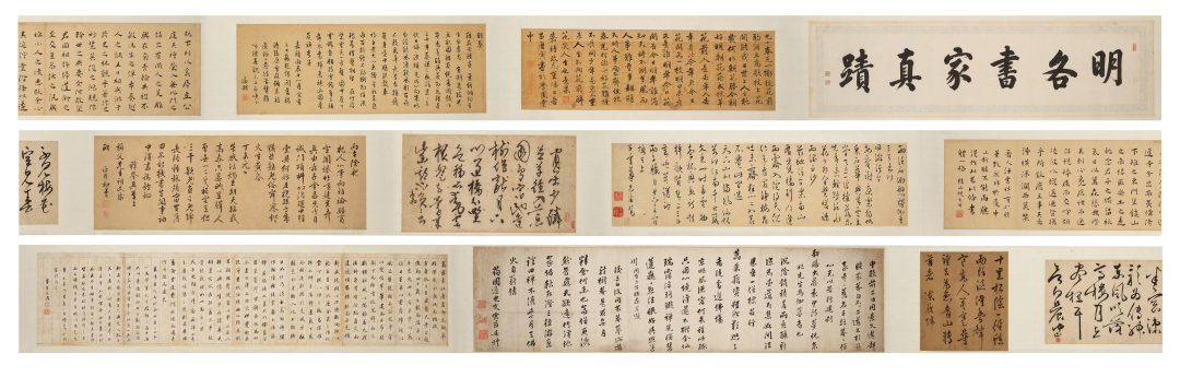 本幅集明代名家手迹,诸如唐寅、文征明、祝允明、董其昌、文震孟等书坛泰斗皆汇于一卷。其中,唐寅行书《花下酌酒歌》、文征明自作《题葵》诗、王宠行书自作诗、王穉登《丙午除夜》、《丁未元日》、文震孟行书五言诗等皆书家自题诗文,可谓诗书合璧,汇聚一卷,实为难得。此外,本幅中各段纸墨皆属上乘,并钤朱之赤、陆时化、王薳等著名鉴藏家之印,识者可宝。