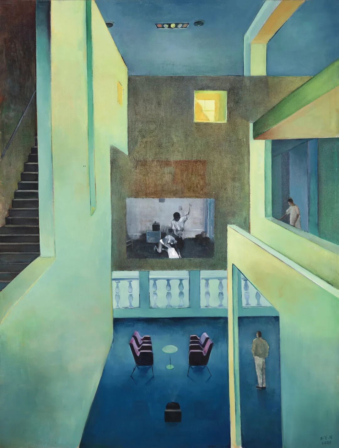 生于 1975 年的韦嘉,成长于 90 年代,他面对社会主义与资本主义冲击下的创作恰是一面镜子,折射了时代与个人的某个视角。2012 年《站着亮》就是其中的佳作。以超现实的画面,述说着社会真实。画中一大一小两位主角,蓄着胡子,就是艺术家本人形象的投射。大韦嘉与小韦嘉,戏剧性地站在一起。从远处望向画面,中间仿如一个大“A”字,形成稳固画面的中间力量。再细观之,是隐隐的高个子男子,有着第三只手,依赖着小男子,才形成了身体的平衡力量。高个男子双手持枪,仿佛要拉开手枪的保险,随时准备驳火。持枪男子,眼神木然,紧抿双唇,作品的张力就从画面透了出来。小男孩双手像是被缚在后,仅着内裤,是不是高个男子前方目标的形象投影?是小韦嘉的心灵力量支撑着大韦嘉?还是小韦嘉拉着大韦嘉?两人的关系为何?韦嘉的作品,留下了线索谜团,让我们解码探究,追寻自己的解答。