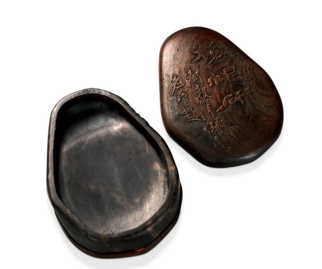 砚盖铭文:梅根研。澍声手琢,老药题。