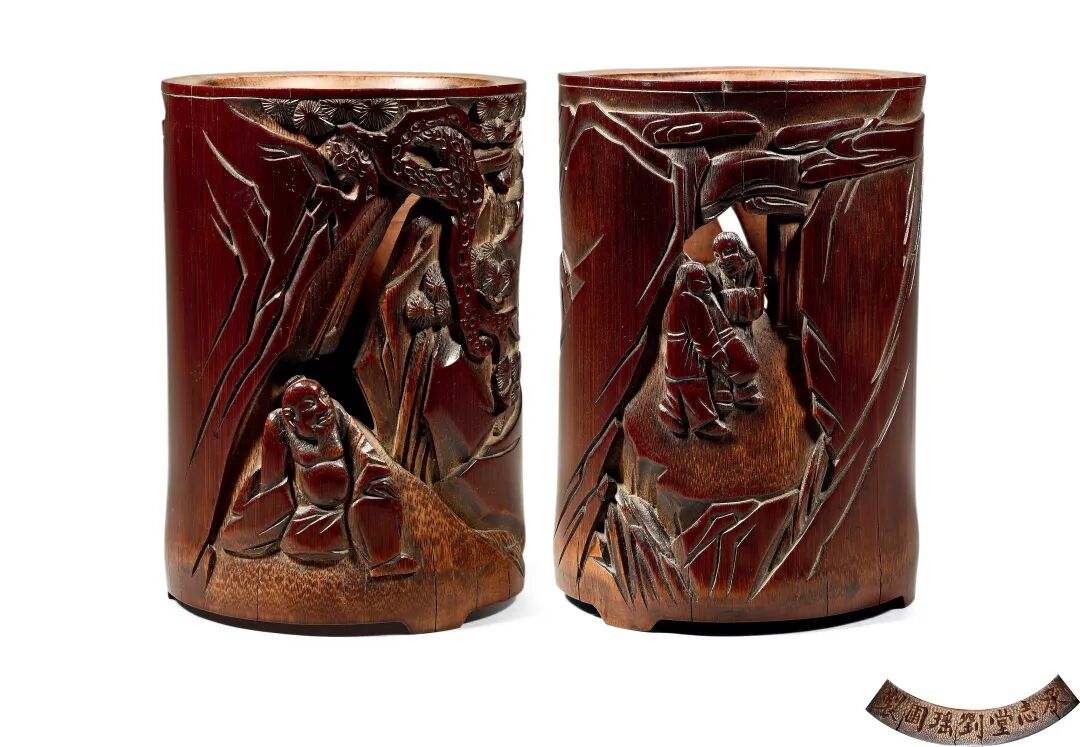 清初竹雕镂空携琴访友图笔筒