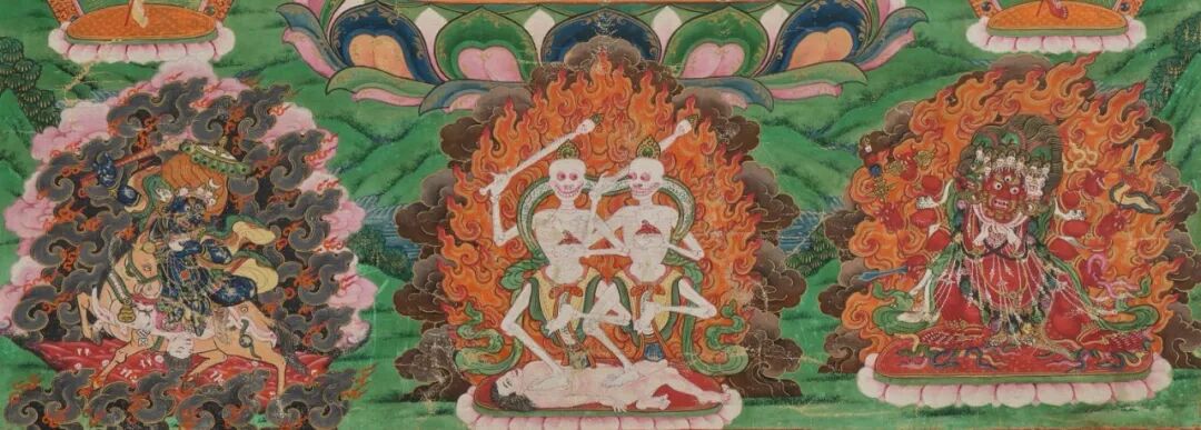 唐卡之风格与北京雍和宫所藏之唐卡十分相似。雍和宫为雍正帝旧邸,乾隆年间改为藏传佛教庙宇,多位西藏及尼泊尔工匠工作于此以完成此愿景。绿色小丘构成的郁郁葱葱的山景、浅绿及浅粉色晕的祥云、背光后的褐色云烟,皆为此唐卡逾其他雍和宫唐卡共有之特征。此外,此唐卡之构图被清晰地分为近、中、远景三段式,与乾隆皇帝在位期间所命造之唐卡构图相同。![]()