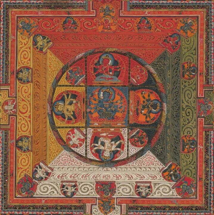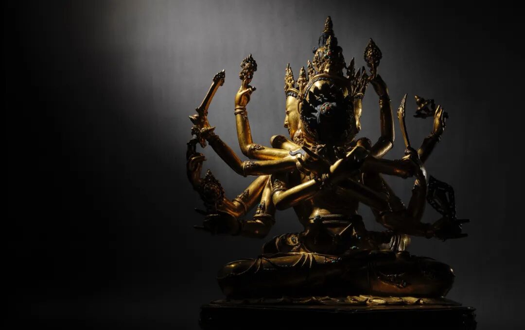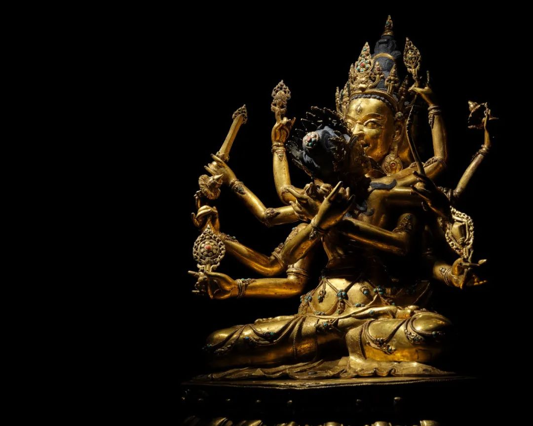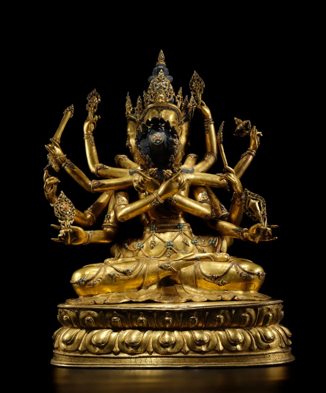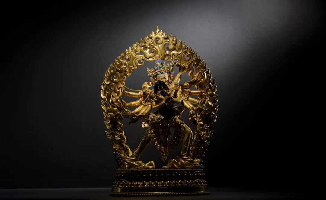 然而,在这一艺术传统中,无任何一尊坐像之体量可与此密集不动金刚像相提并论。事实上,此尊密集不动金刚像如此震撼之体量,或令其成为所有曾经释出于世的造像中最大型的西藏双身铜像。双身像以佛母与佛父欢喜相拥之态,象征智慧与慈悲之结合,堪称藏传佛教艺术最具魅力之题材,成为其宗教之独特意涵及物质文化之代表符号。双身像频繁地被用于表现密集金刚等藏传佛教之本尊,为密宗中重要的一类「观想神祇」。其他备受喜爱之本尊包括胜乐金刚、大威德金刚、喜金刚及时轮金刚。这些本尊与围绕其身边的伴神置身于曼荼罗之中,构成密宗《无上瑜伽怛特罗》教法之主题。![]()